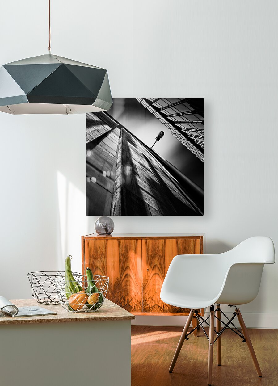 An architectural study capturing an alley lamp in an Amsterdam side street viewed from a striking upward angle between two buildings. The bold lines of the architecture frame the lamp while streaking clouds overhead add a sense of movement and drama. A great photograph for those who appreciate modern perspectives on urban design and the interplay of light and form.