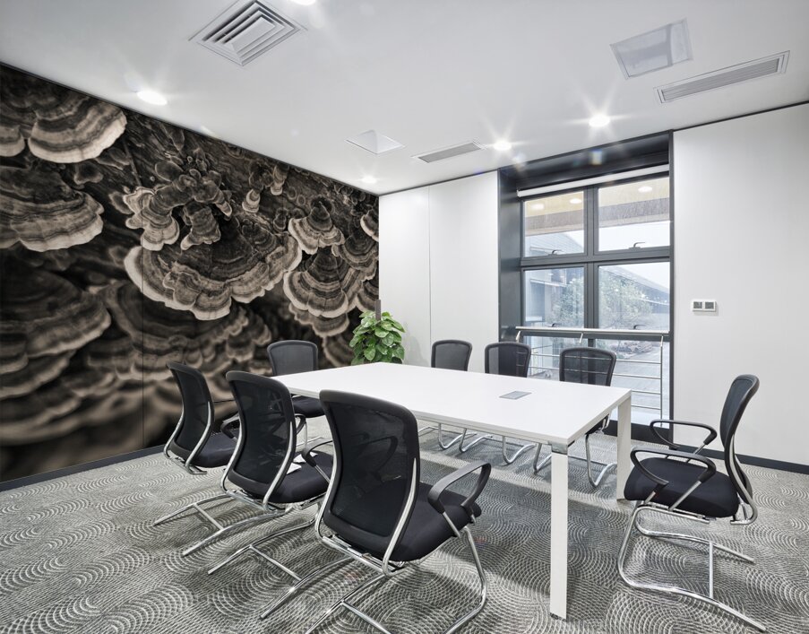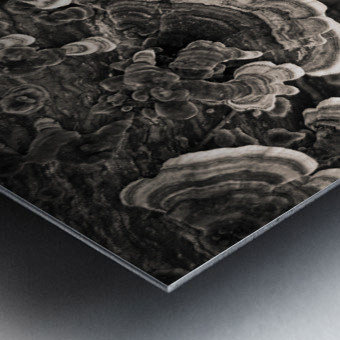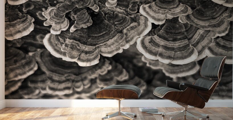 A semi-abstract photograph capturing the intricate layered patterns of bracket fungi viewed from above. The textures and flowing contours create a natural rhythm inviting closer inspection of nature’s artistry. A great photograph for those who appreciate organic forms and the subtle beauty of the natural world.
