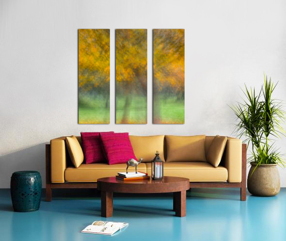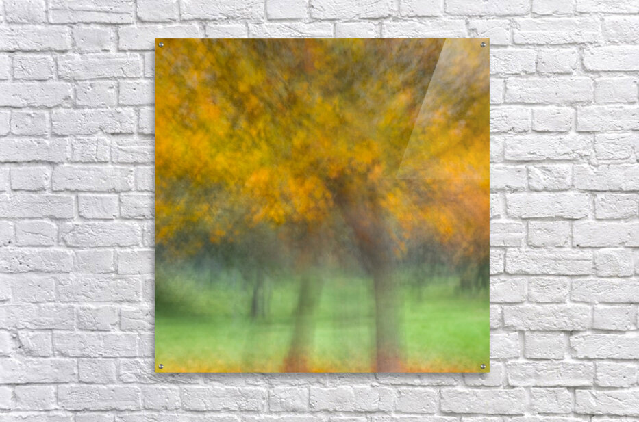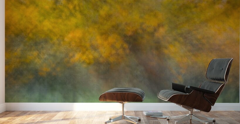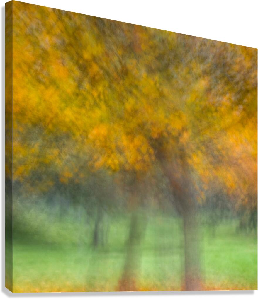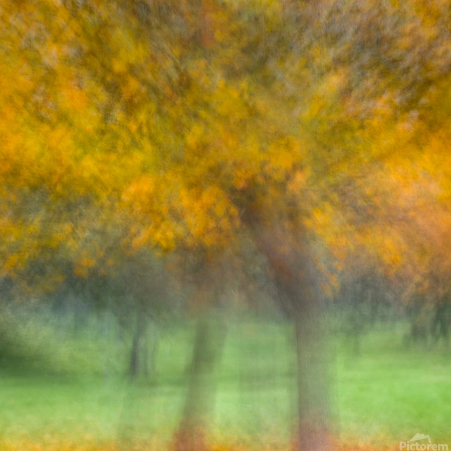 A semi-abstract photograph of autumn trees where vivid yellow leaves blur into a rhythmic flow creating a sense of movement and energy. The golden canopy contrasts with the soft texture of the grass below evoking the fleeting beauty of the season. A great photograph for those who cherish the vibrant warmth of autumn’s palette.