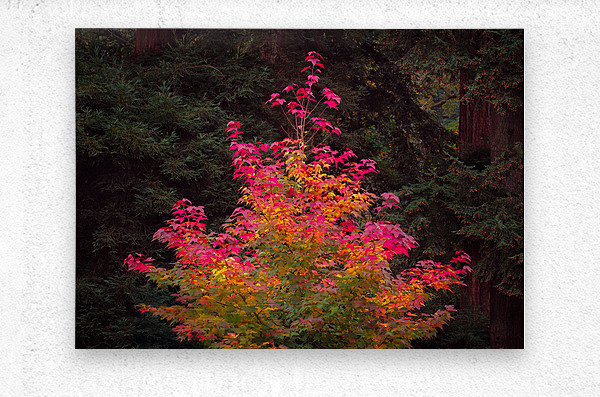 A vibrant tree stands out in the forest its autumn foliage glowing like a flame amidst the surrounding evergreens. The fiery hues of its leaves create a striking contrast against the deep greens drawing the eye to this fleeting moment of seasonal brilliance. A great photograph for those who love the vivid beauty and drama of nature in autumn.