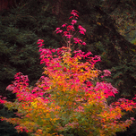 A vibrant tree stands out in the forest its autumn foliage glowing like a flame amidst the surrounding evergreens. The fiery hues of its leaves create a striking contrast against the deep greens drawing the eye to this fleeting moment of seasonal brilliance. A great photograph for those who love the vivid beauty and drama of nature in autumn.