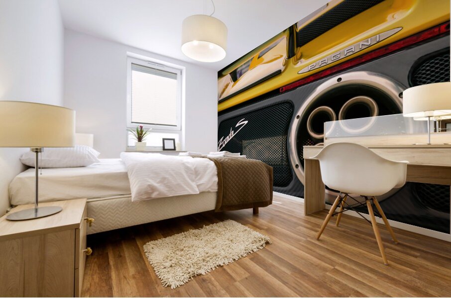 The rear section of a yellow Pagani Zonda S hypercar showcasing its aggressive aerodynamics and distinctive quad exhaust. Every detail reflects the precision engineering and striking design that make the Zonda a legend among high-performance cars. A great photograph for supercar enthusiasts and collectors who appreciate automotive excellence.