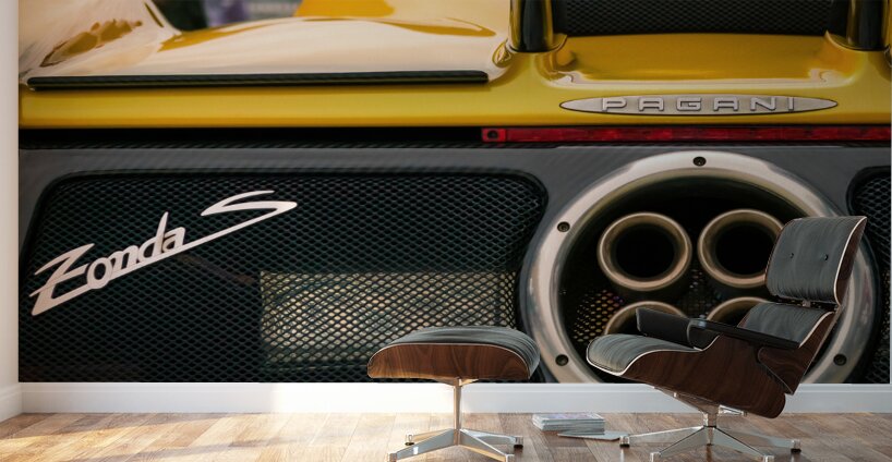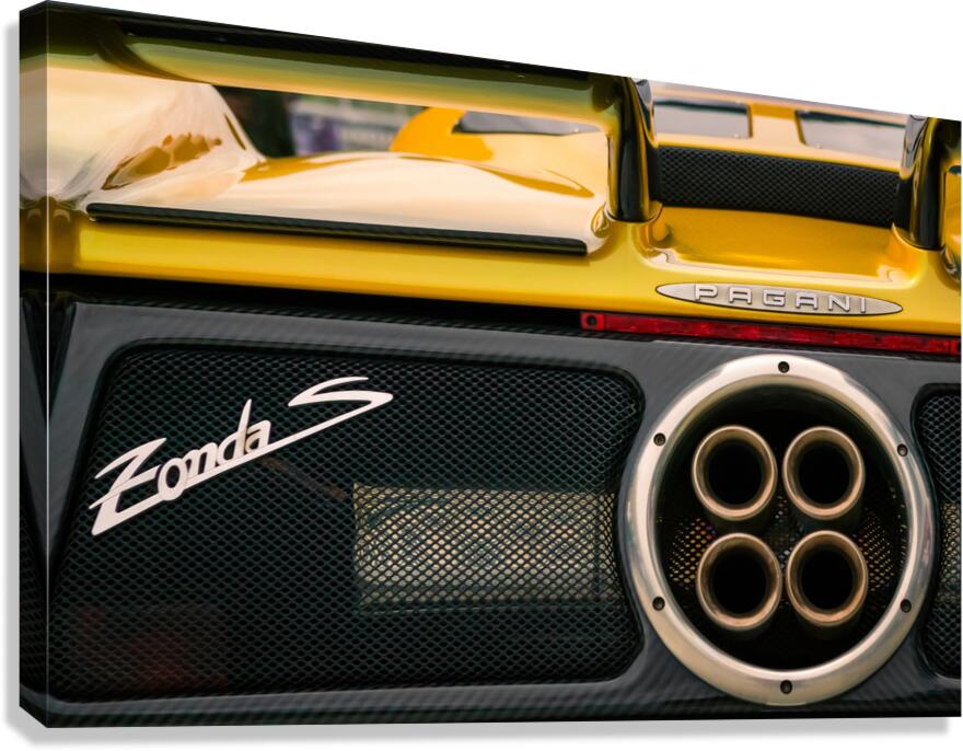 The rear section of a yellow Pagani Zonda S hypercar showcasing its aggressive aerodynamics and distinctive quad exhaust. Every detail reflects the precision engineering and striking design that make the Zonda a legend among high-performance cars. A great photograph for supercar enthusiasts and collectors who appreciate automotive excellence.