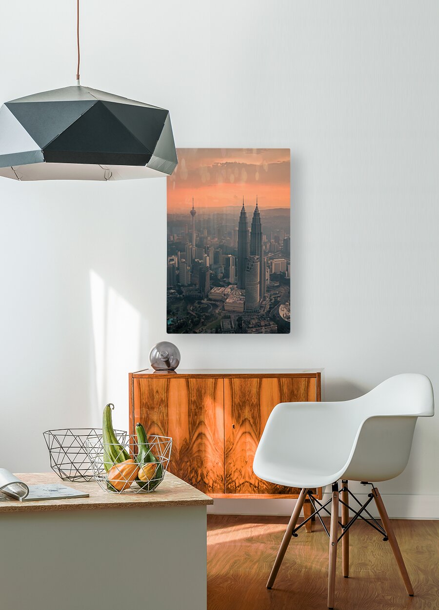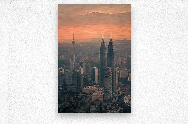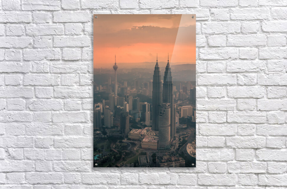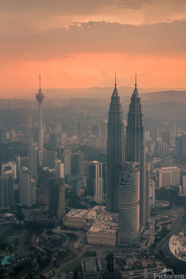 An aerial view of Kuala Lumpur featuring the iconic Petronas Towers and Menara Tower standing tall above the city. A light haze softens the skyline while the sun casts an orange glow as it filters through the clouds. The atmosphere adds a sense of depth capturing the dynamic energy of Malaysia’s capital. A great photograph for those drawn to striking cityscapes and the ever-changing moods of urban life.