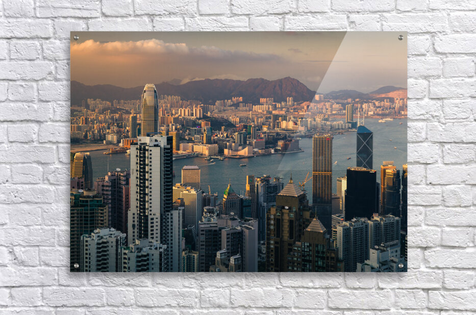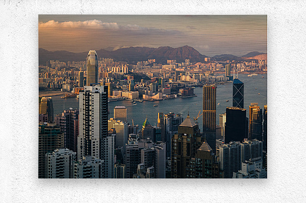 A view from The Peak overlooking Hong Kong at sunset as the last light of the day catches the sides of the buildings. The citys skyline rises above the harbour with boats visible on the water and distant hills fading into the evening sky. A great photograph for those who appreciate urban landscapes and the atmosphere of a city at dusk.