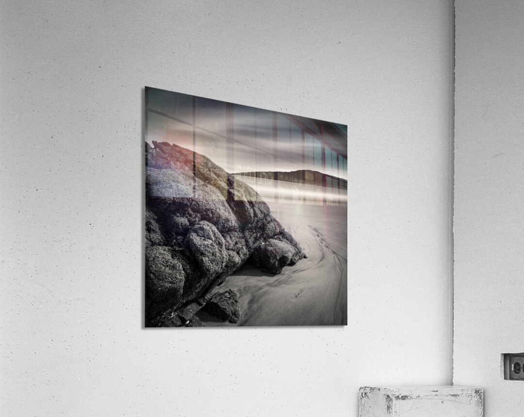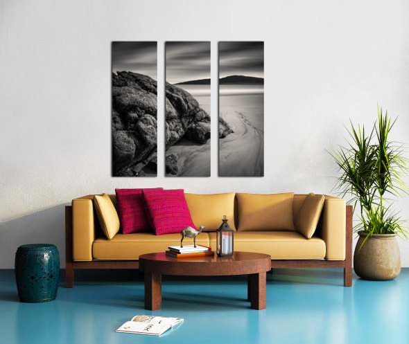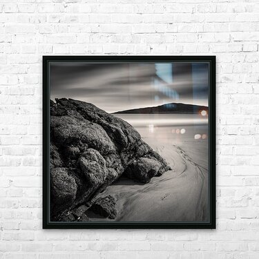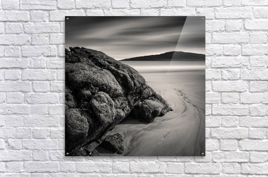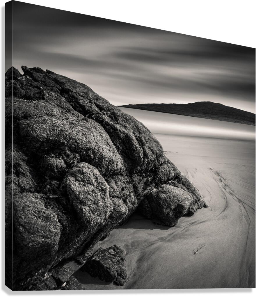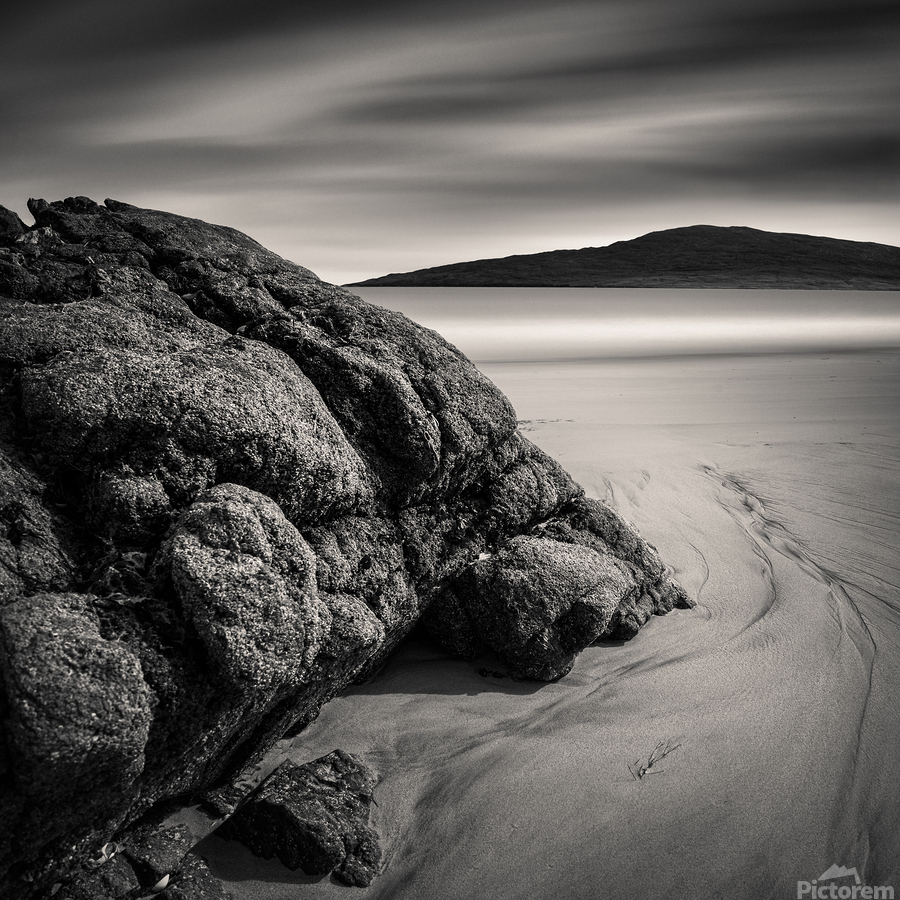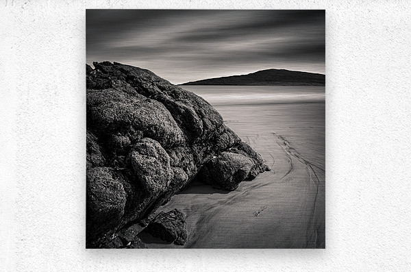 Rocks rest gently among the sand ripples of Seilebost Beach on the Isle of Harris Scotland creating a calm minimalist scene. The simple lines and textures highlight the quiet beauty of this coastal landscape. A great photograph for those who appreciate understated elegance and the natural patterns shaped by land and sea.