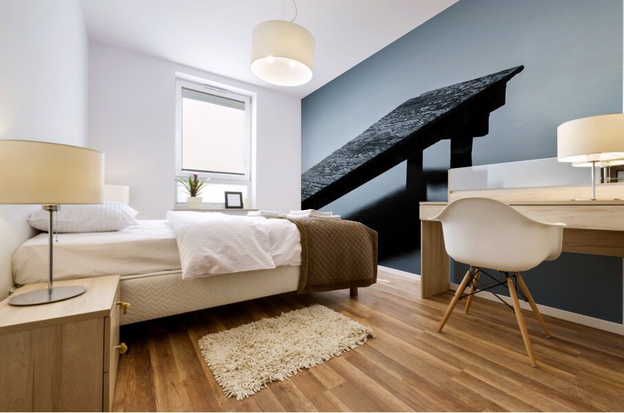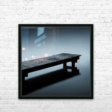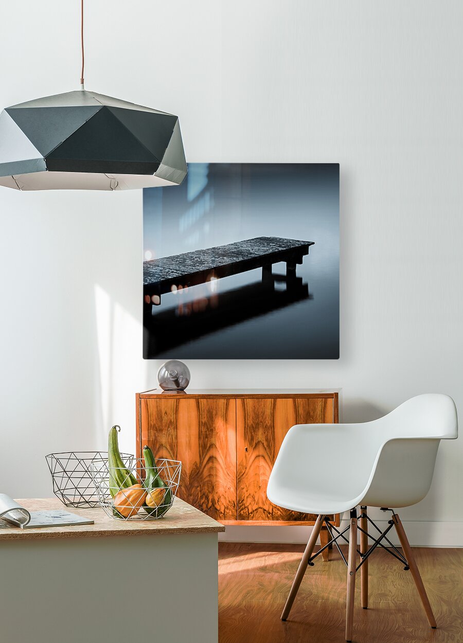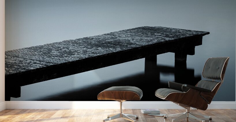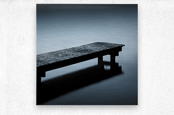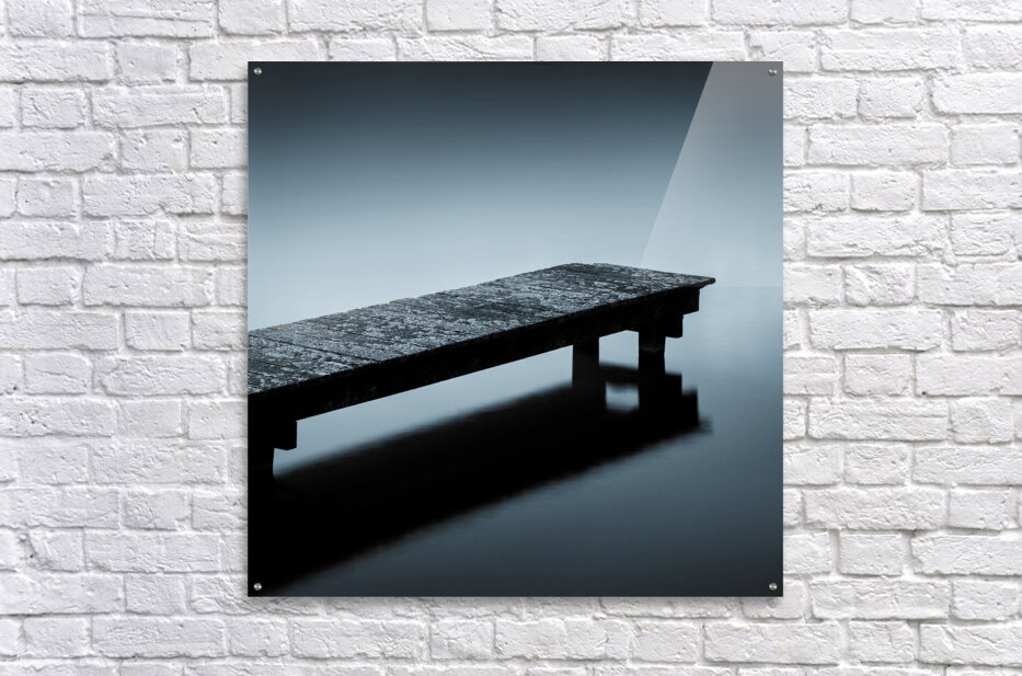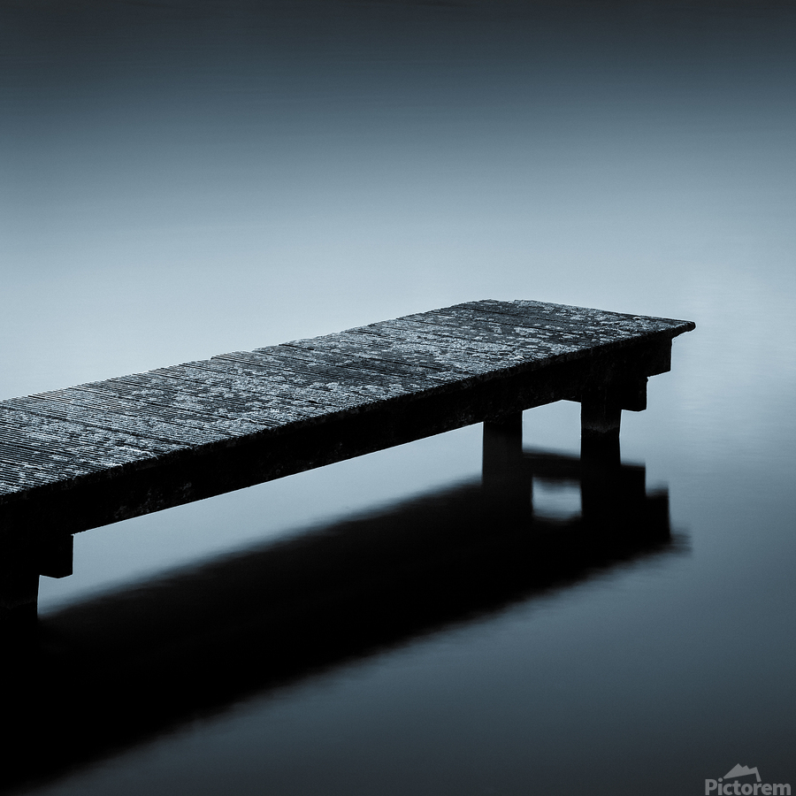 A minimalist view of a moss-covered wooden jetty in Sluipwijk Netherlands surrounded by still open water. The scene is stripped of distractions creating a sense of solitude and calm. The subtle blue toning enhances the quiet almost meditative atmosphere. A great photograph for those drawn to simplicity negative space and the tranquility of water.