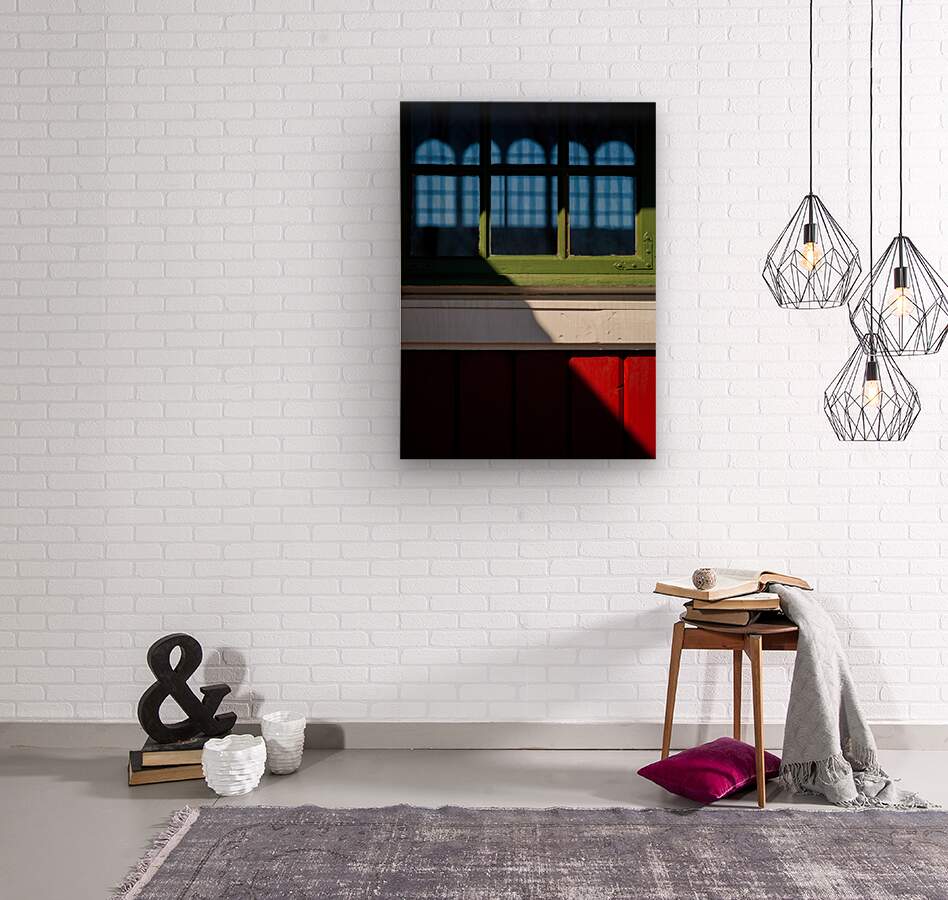 A semi-abstract view of a window at Buksnes Church on the Lofoten Islands Norway. Sunlight cuts sharply across the scene casting a bold shadow that divides the red wooden exterior from the green window frame. Through the glass a window on the opposite side reveals a glimpse of blue sky adding depth and a sense of stillness. A perfect photograph for those drawn to the interplay of light colour and architectural detail.