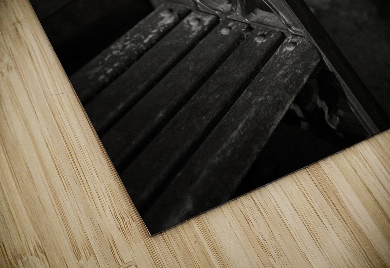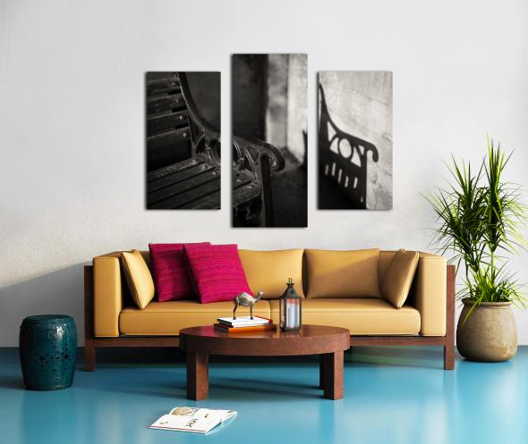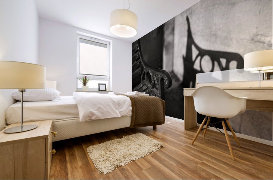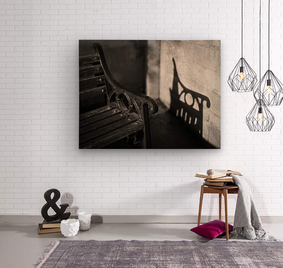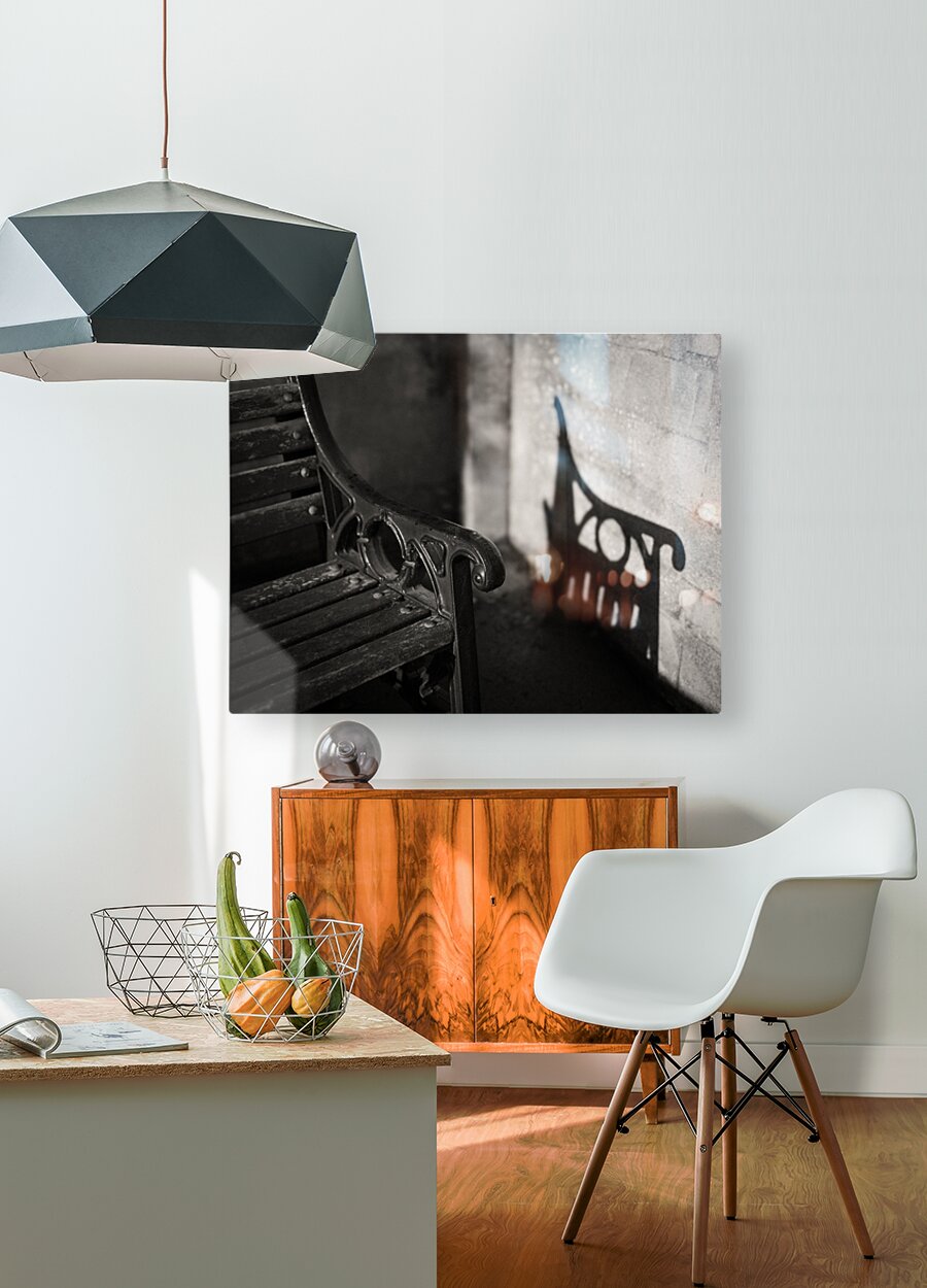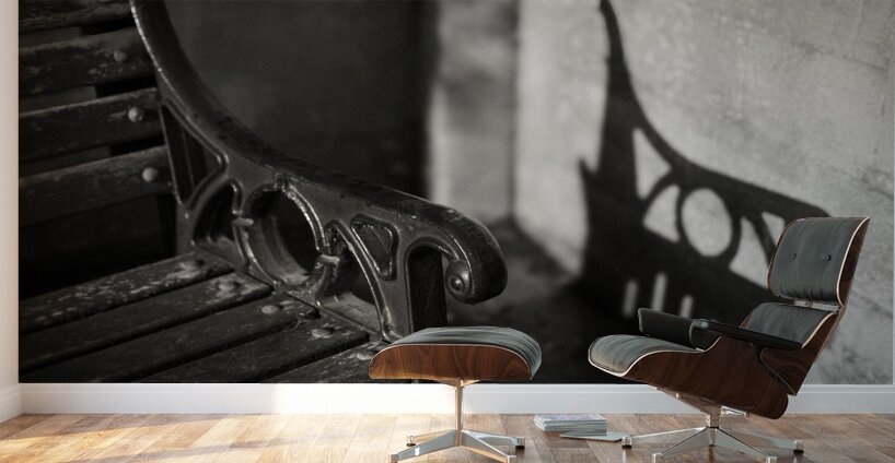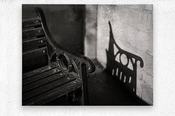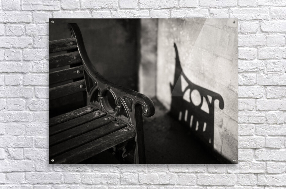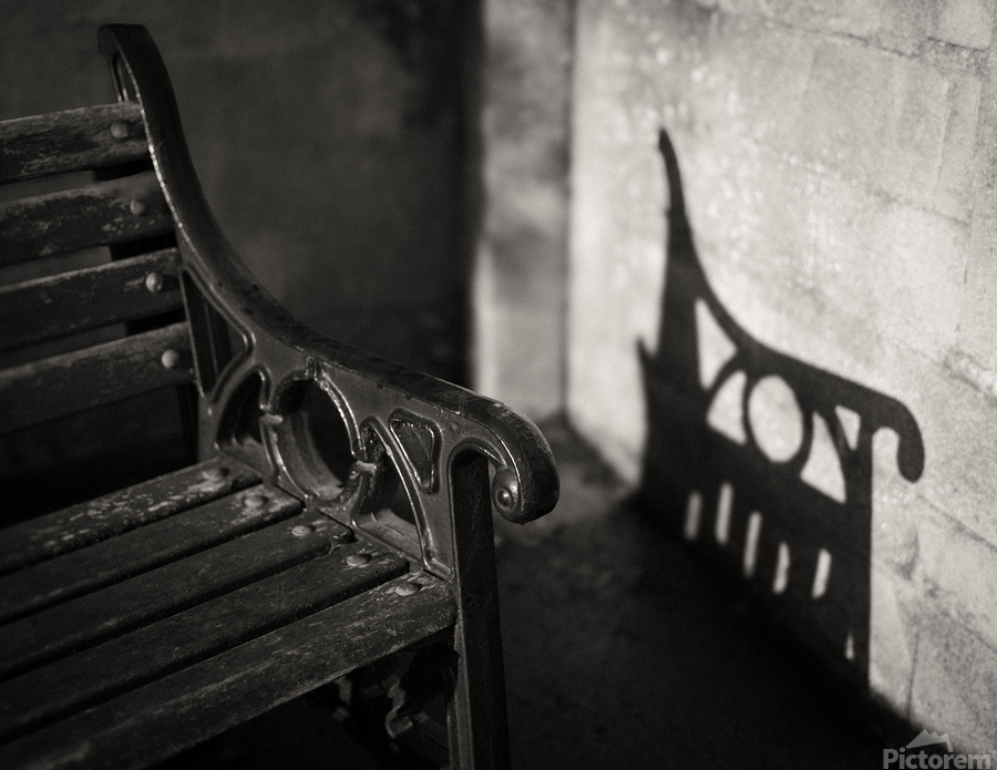 A photograph of a public bench in Baths Parade Gardens where winter sunlight casts its shadow against the wall. The weathered metal and wood hint at years of use while the interplay of light and form creates a quiet understated beauty. A perfect photograph for those who appreciate the charm of everyday details and the character of historic English settings. ..... Please Note: This image is intentionally presented with a grainy texture as part of its aesthetic.
