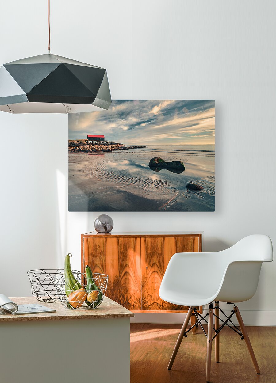 The old Dunaverty Lifeboat Station stands against a dramatic sky in Argyll Scotland as the sun begins to set. Warm yellow light breaks through the clouds casting a glow that reflects in pools of water left by the receding tide. The scene captures a fleeting moment where history and nature meet making it a great photograph for those who appreciate Scotland’s coastal heritage and ever-changing light.
