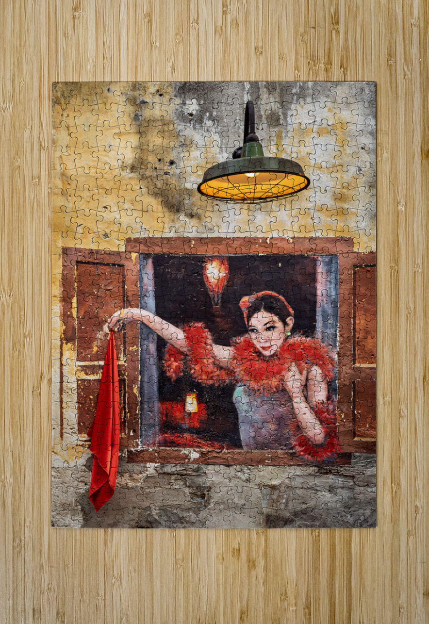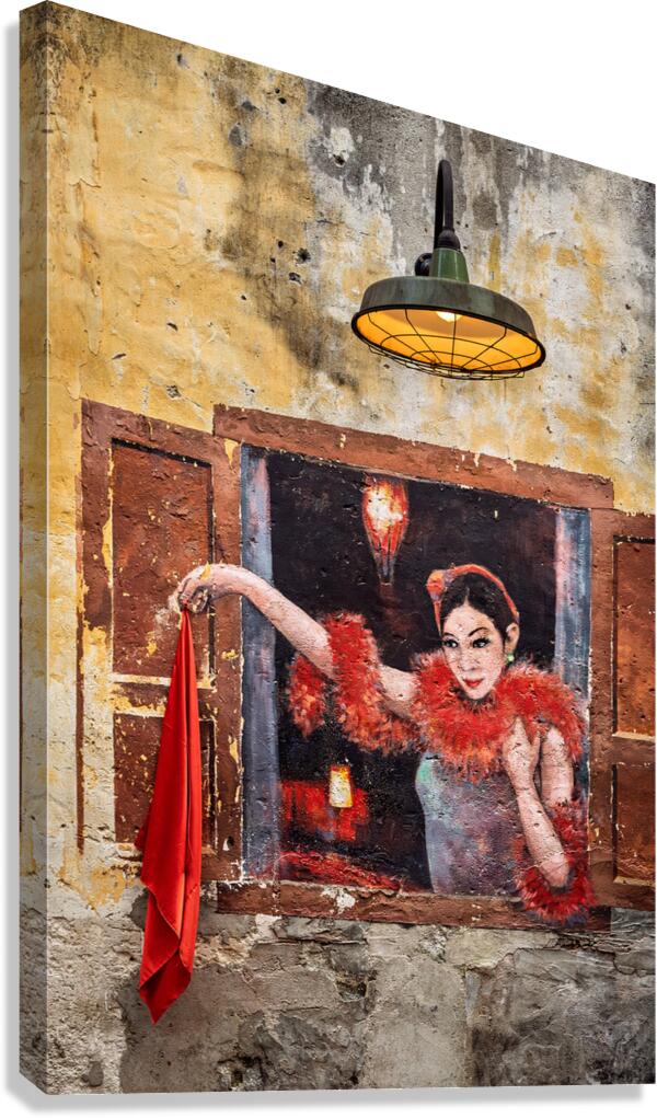A vibrant piece of wall art in Kuala Lumpurs Kwai Chai Hong a historic corner of Chinatown near Petaling Street. The mural depicts a lady waving a red scarf adding movement and character to the areas rich cultural atmosphere. A lit vintage lamp above the artwork casts a warm glow enhancing the murals charm. A great photograph for those drawn to urban art and the heritage of Kuala Lumpur.