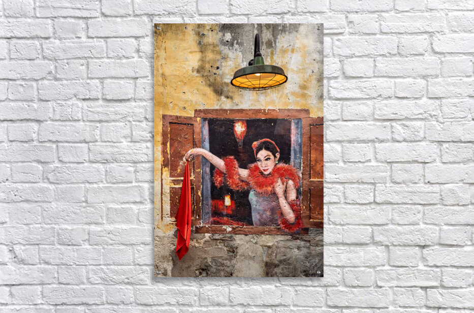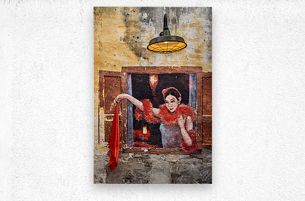 A vibrant piece of wall art in Kuala Lumpurs Kwai Chai Hong a historic corner of Chinatown near Petaling Street. The mural depicts a lady waving a red scarf adding movement and character to the areas rich cultural atmosphere. A lit vintage lamp above the artwork casts a warm glow enhancing the murals charm. A great photograph for those drawn to urban art and the heritage of Kuala Lumpur.