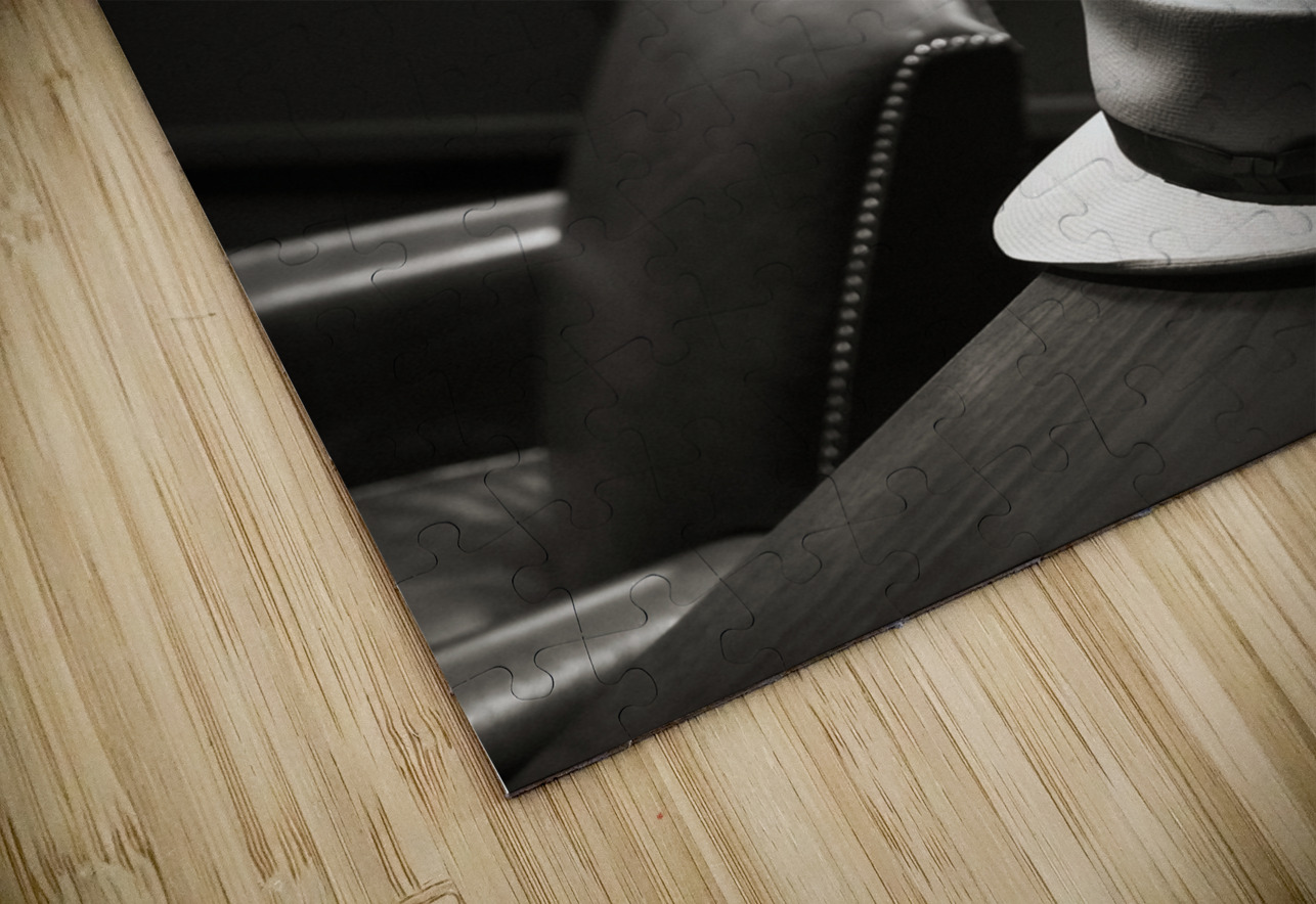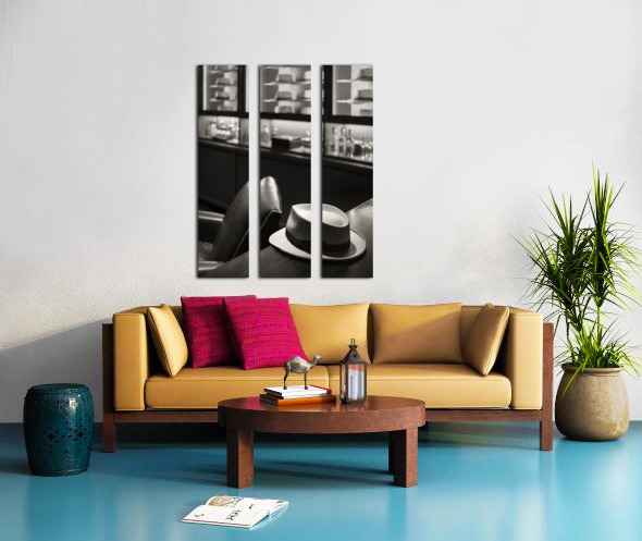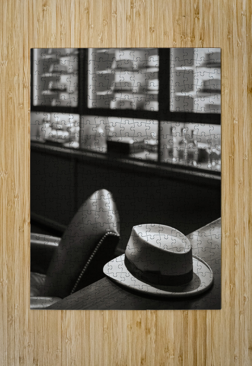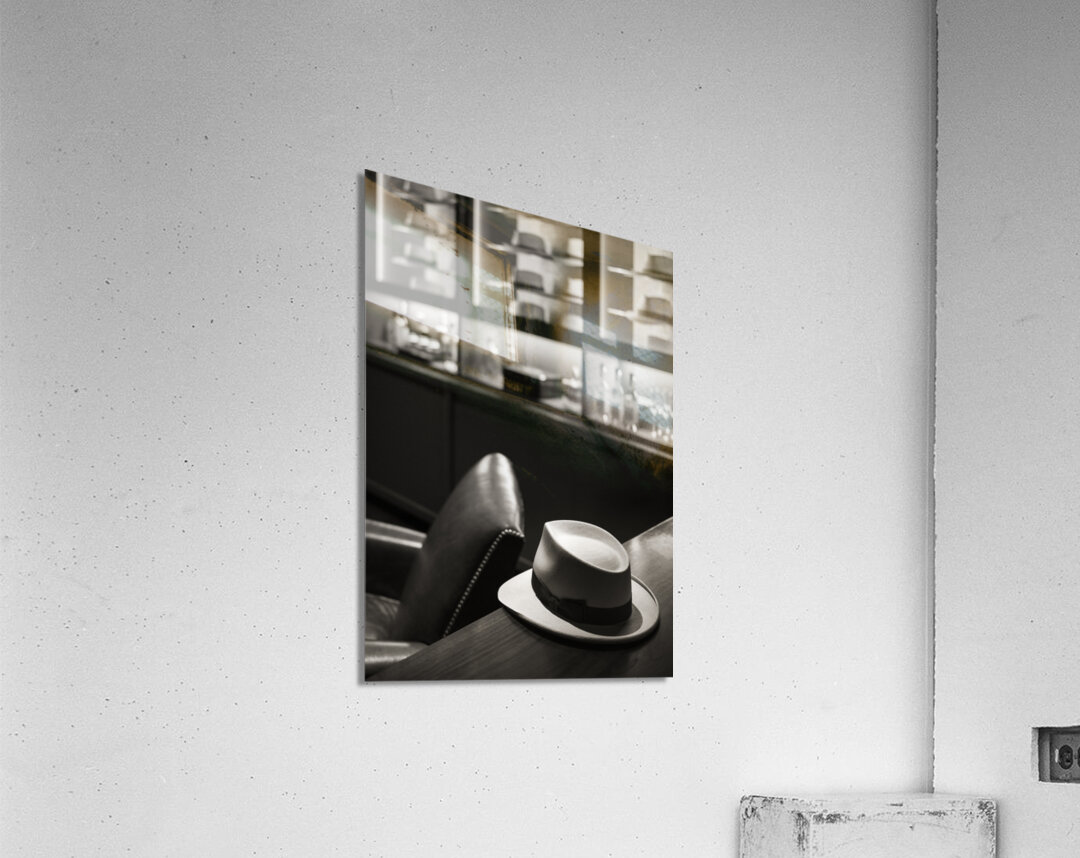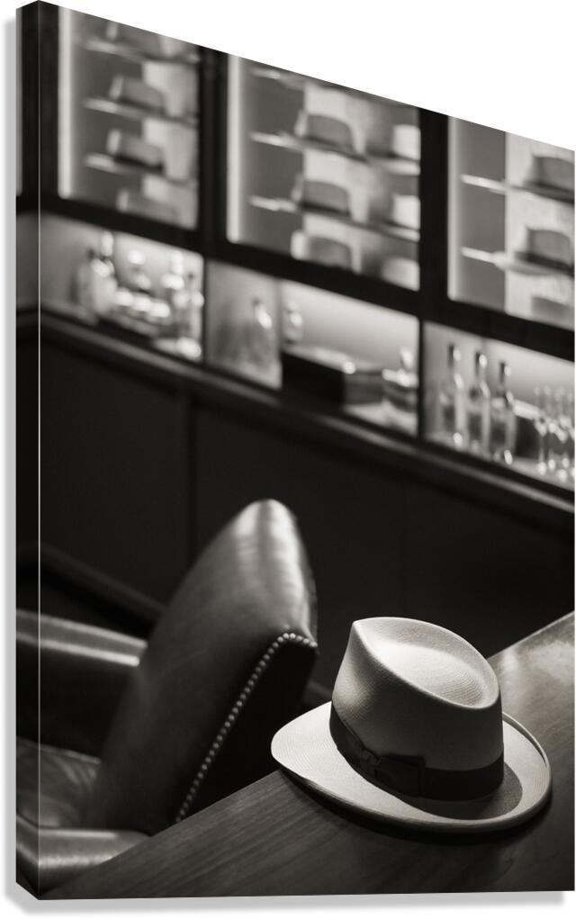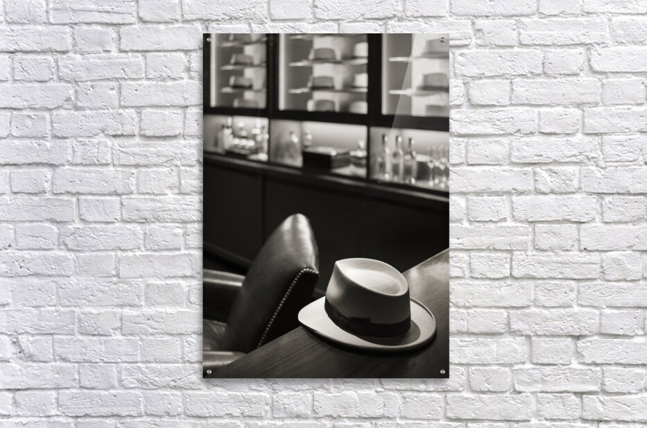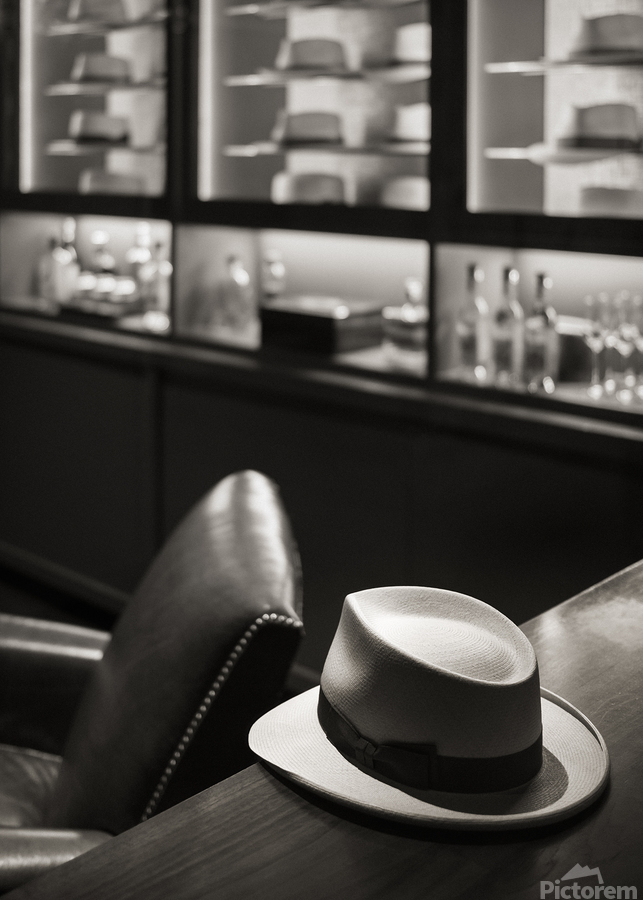 A Panama hat shop in Chicago where a single hat rests on a wooden table inviting a sense of timeless craftsmanship. In the background a vintage leathe...[+]