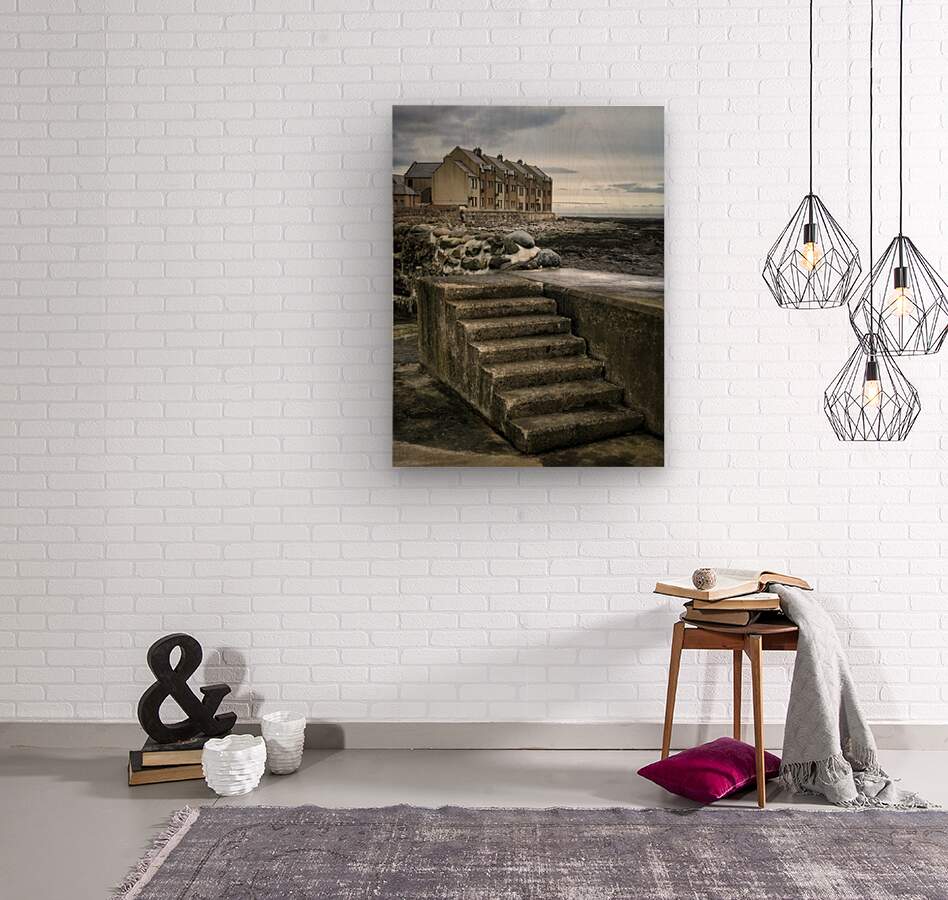 Looking back from the harbour wall at Gourdon seafront in Aberdeenshire Scotland this photograph captures the charm of the coastal village. Stone steps lead up to the harbour wall in the foreground while the row of houses lining the seafront adds a sense of community and timeless character. A great photograph for those who appreciate the simple beauty and coastal life of Scotland’s fishing villages.