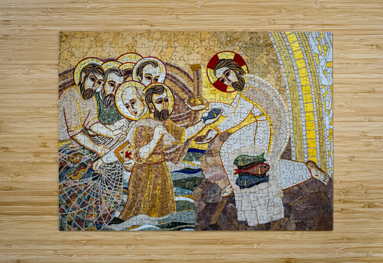 Intricate mosaic work at the Basilica of the National Shrine of the Blessed Virgin of Ta’ Pinu in Gozo Malta depicting the biblical scene of Jesus performing the miracle of the loaves and fishes. The rich textures and careful craftsmanship bring depth to the moment capturing its spiritual significance. A great photograph for those who appreciate sacred art and the timeless beauty of religious storytelling.