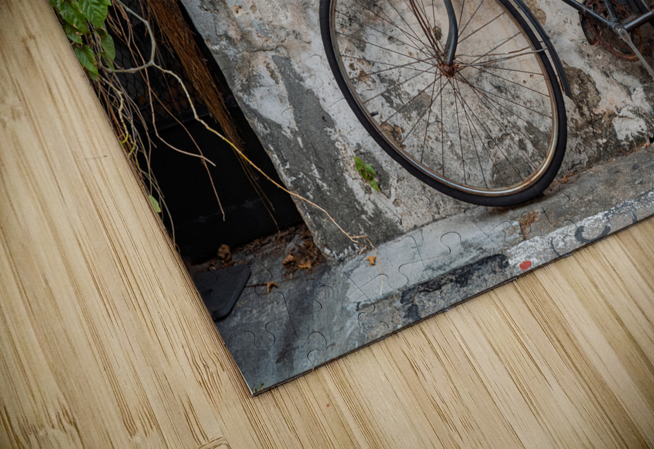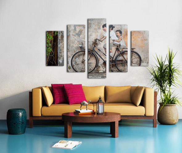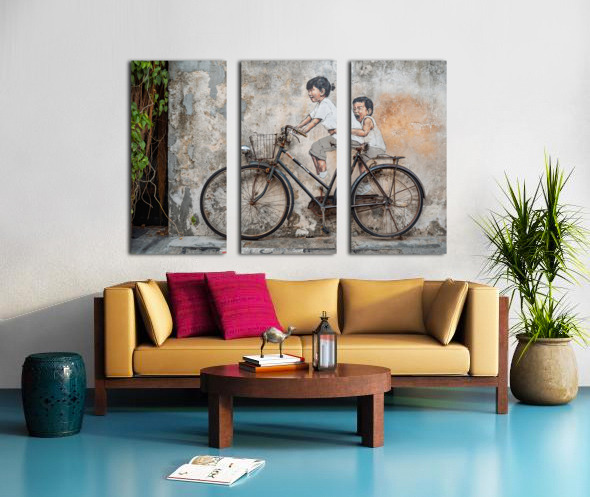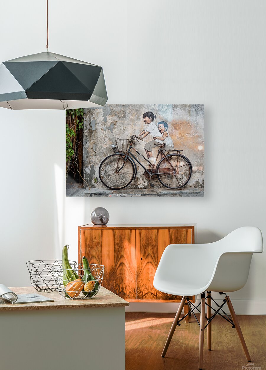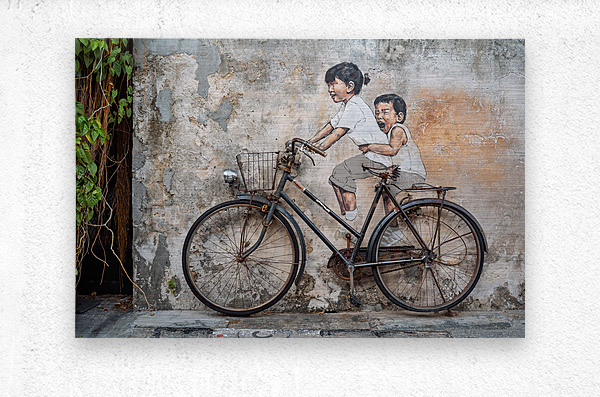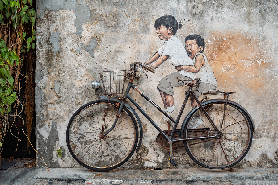 A well-known street art mural in George Town Penang Malaysia depicting two children riding a bicycle. Their expressions capture a sense of joy and movement blending seamlessly with the real mounted bicycle beneath them. Created by Lithuanian artist Ernest Zacharevic this piece has become an iconic part of George Town’s cultural landscape. A great photograph for those who appreciate urban art and the charm of Penang’s historic streets.