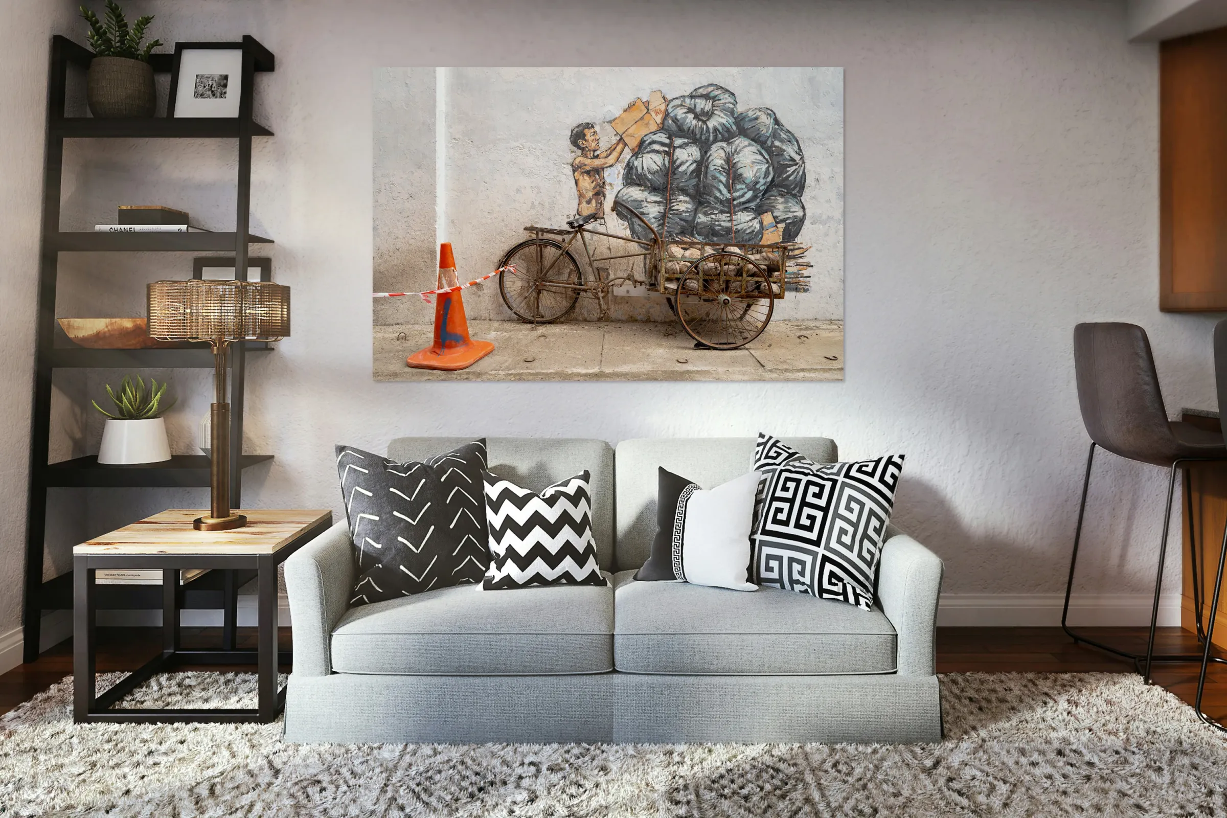A wall mural in Ipoh Malaysia creatively blending art with reality. A painted man struggles to balance an overloaded tricycle piled high with goods while the actual tricycle stands in place blurring the line between two and three dimensions. In the foreground a lone orange road cone adds an unexpected modern touch to the scene. A great photograph for those who appreciate urban street art and the playful interaction between murals and their surroundings.