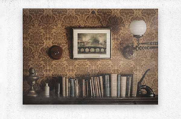 A shelf of early 20th-century books sits above a fireplace in Beamish, County Durham, untouched by time. A framed black-and-white picture hangs above, blending seamlessly with the patterned wallpaper of the era. The entire scene feels like a preserved moment from over a century ago. A great photograph for those with an interest in vintage interiors and historical settings. ..... Please Note: This image is intentionally presented with a grainy texture as part of its aesthetic.