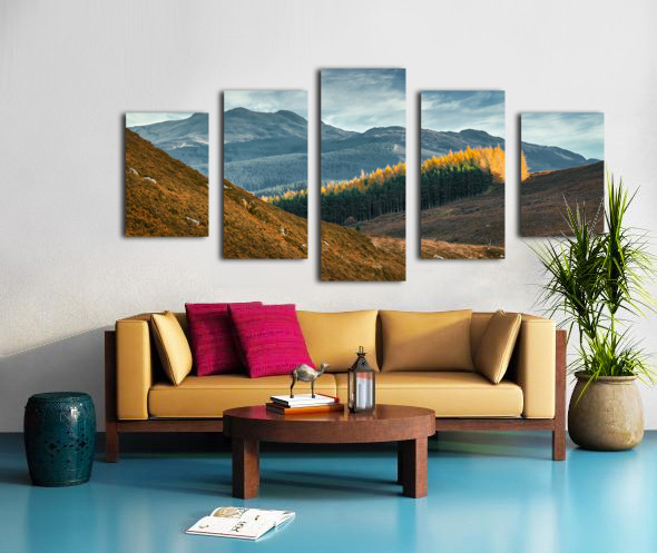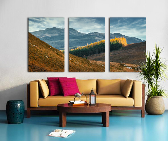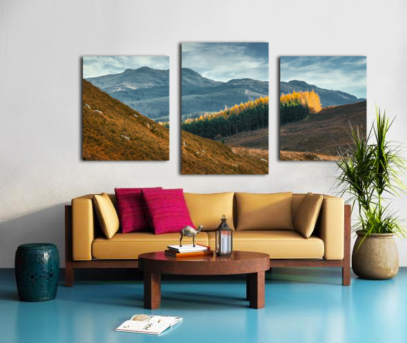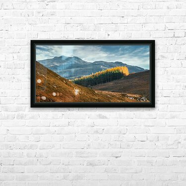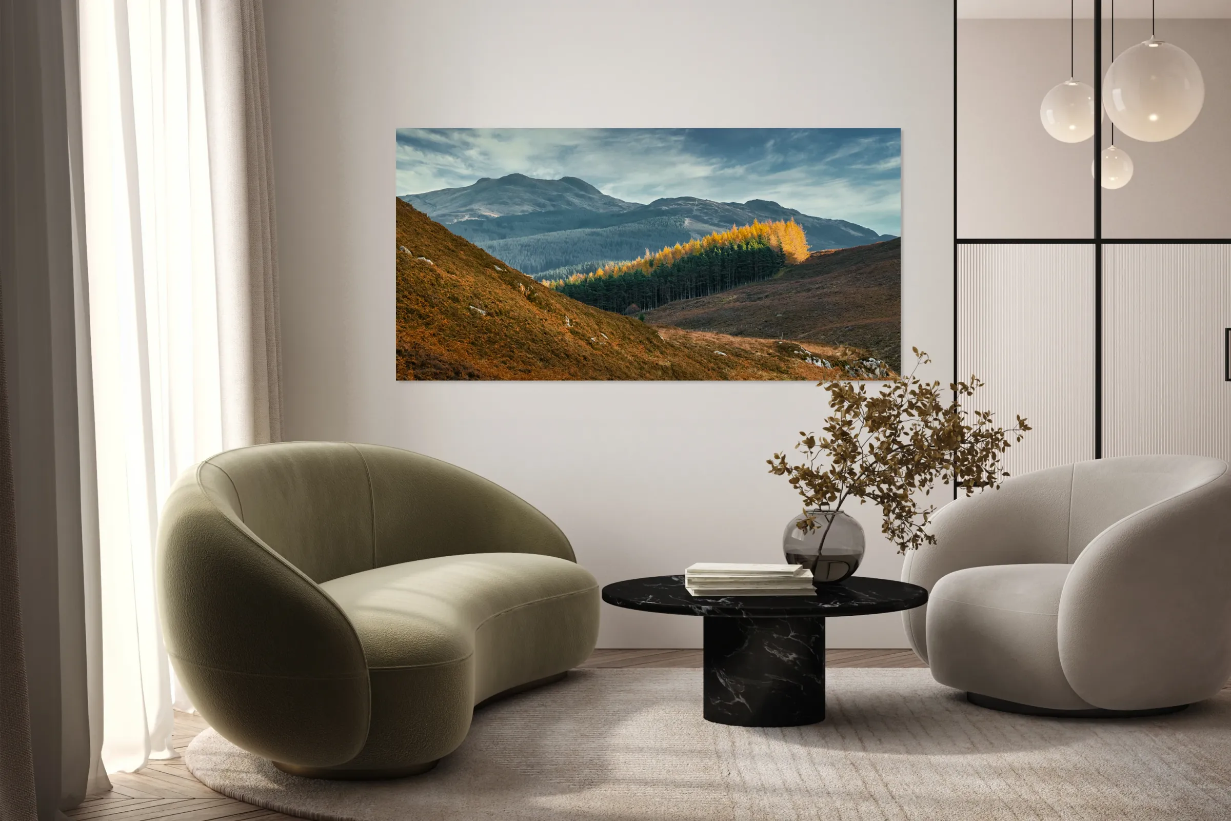 A group of fir trees stands on a hillside at the edge of Tay Forest Park in autumn their dark forms contrasting with the surrounding landscape. In the distance mountains rise beneath a sky of wispy clouds adding depth to the scene. A great photograph for those who appreciate the quiet beauty of Scotland’s seasonal landscapes.