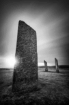 The Standing Stones of Stenness on Orkney Scotland captured at sunrise as the sun peeks from behind the ancient stones. Light and shadow carve out their weathered surfaces adding a sense of mystery and timelessness to the scene. A great photograph for those drawn to the history and atmosphere of Scotland’s prehistoric landscapes. ..... Please Note: This image is intentionally presented with a grainy texture as part of its aesthetic.