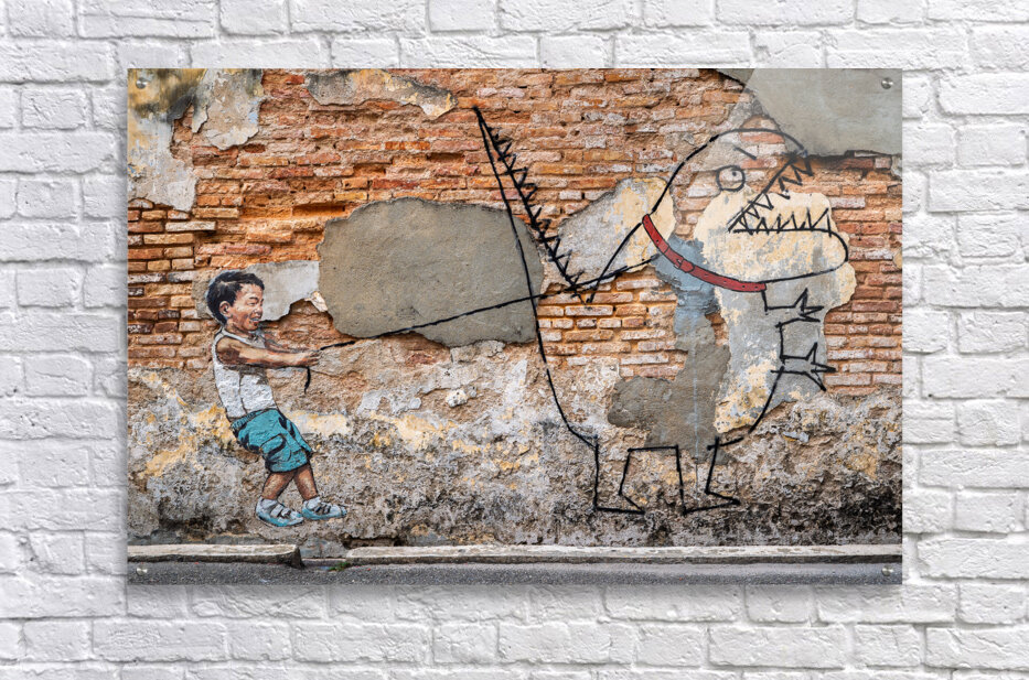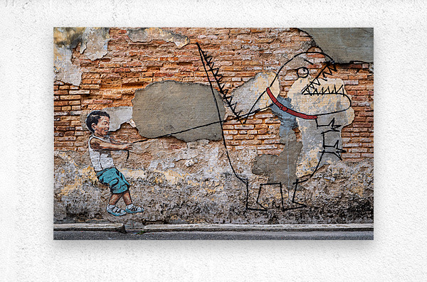 A striking street art mural in George Town Penang Malaysia depicting a boy holding a lead attached to a simple childlike drawing of a dinosaur. The co...[+]