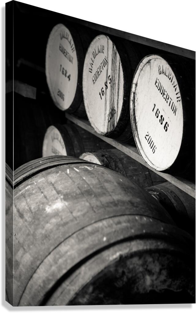 Malt whisky barrels ageing in a traditional Scottish distillery their surfaces marked by time and craft. The dim light and deep shadows add to the sense of heritage evoking the patience and skill behind every cask. One of a series capturing the whisky-making process and the atmosphere of the distillery. A great photograph for whisky enthusiasts and those who appreciate the craftsmanship of Scotland’s most iconic spirit.