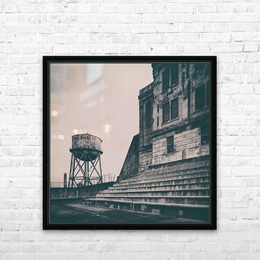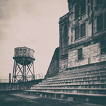 A photograph capturing the stark atmosphere of Alcatrazs recreation yard featuring the wide steep steps where inmates once sat and the towering water tower standing beyond. The imposing walls and weathered surfaces evoke a sense of isolation and history reflecting the daily reality of the prisoners. A compelling image for those interested in the profound narratives of historic penitentiaries. ..... Please Note: This image is intentionally presented with a grainy texture as part of its aesthetic.