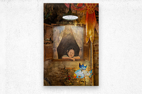 A wall mural in the famous Kwai Chai Hong area of Kuala Lumpur Malaysia featuring a painting of a young girl leaning through a window. The scene is illuminated by an overhead light blending art with reality. In front of the mural a multi-coloured fish with an internal light added for the Chinese New Year celebrations adds a vibrant contrast. A great photograph for those who appreciate street art cultural heritage and the festive atmosphere of Kuala Lumpur.