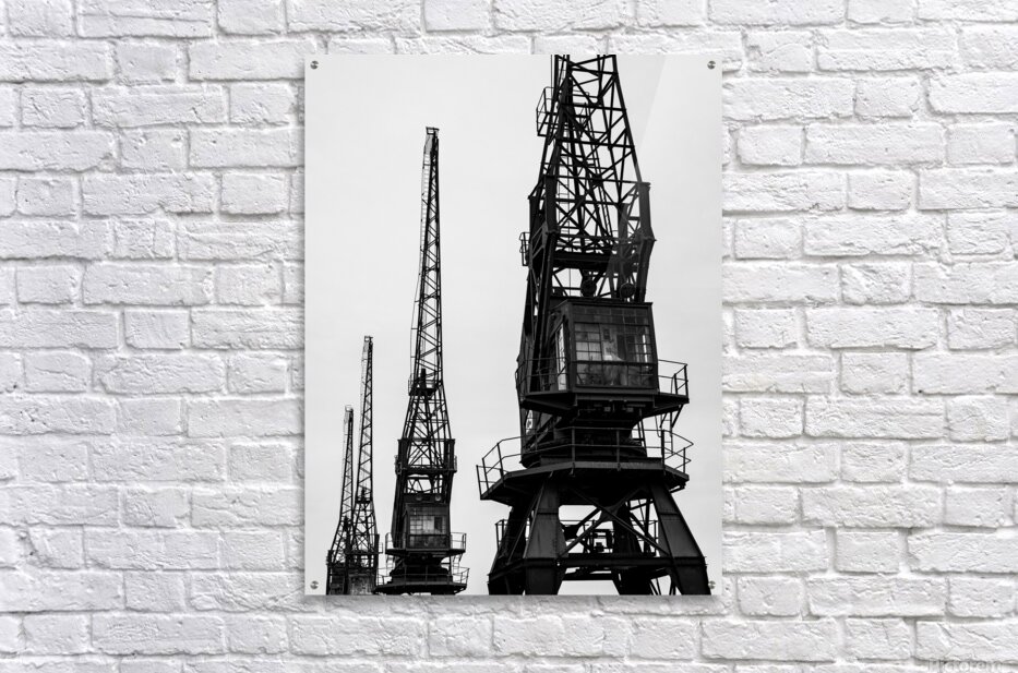 Vintage cargo cranes at Bristol Port England stand tall against a featureless sky their angular forms reduced almost to silhouette. The stark simplicity of the scene brings out the industrial elegance of these historic structures offering a quiet reflection on the city’s working past. A great photograph for those who appreciate industrial heritage and minimalist composition.
