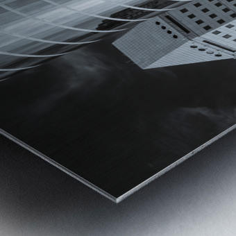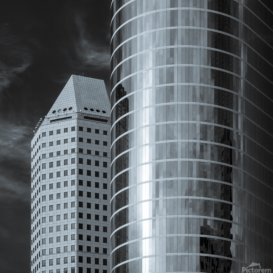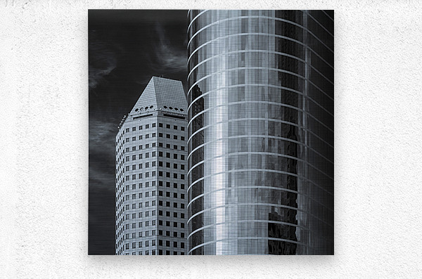 A close-up view of two skyscrapers in downtown Houston Texas—one with a sweeping glass curve the other more rigid and angular with a grid of smaller windows. The contrast in form and texture creates a bold graphic composition that highlights the architectural character of the city. A great photograph for those who appreciate urban geometry and the striking lines of modern architecture.
