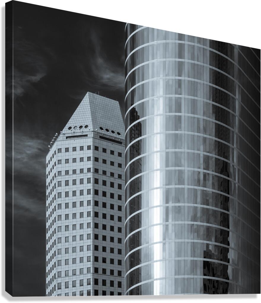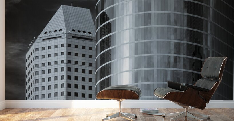 A close-up view of two skyscrapers in downtown Houston Texas—one with a sweeping glass curve the other more rigid and angular with a grid of smaller windows. The contrast in form and texture creates a bold graphic composition that highlights the architectural character of the city. A great photograph for those who appreciate urban geometry and the striking lines of modern architecture.