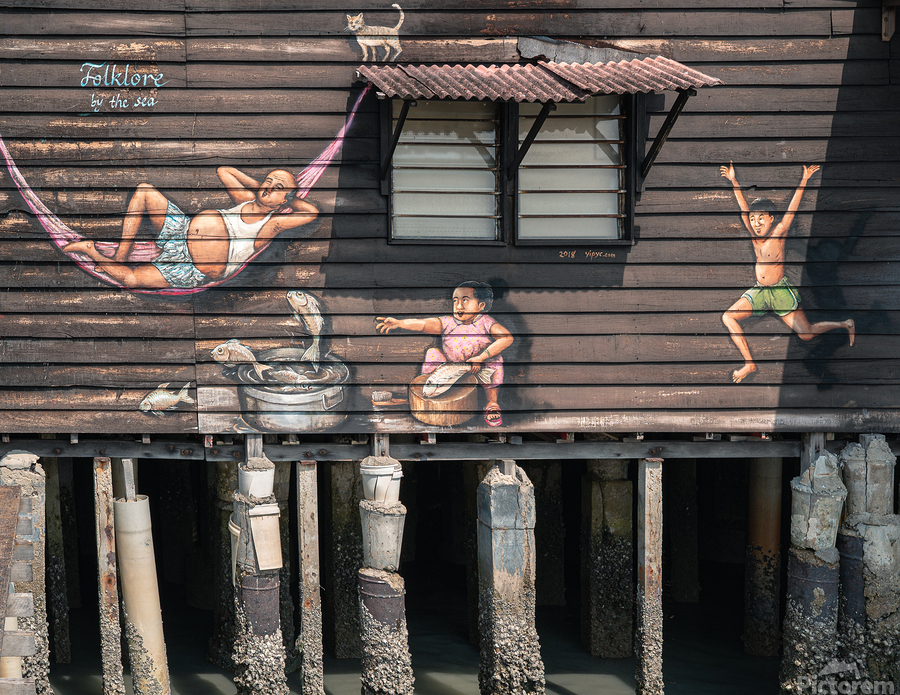 The Folklore by the Sea wall mural on Chew Jetty in Penang Malaysia captures the quiet charm of one of the island’s oldest waterfront communities. Painted on the side of a stilt house the mural blends local tradition with a strong sense of place reflecting the close relationship between daily life and the sea. A great photograph for those who appreciate cultural heritage coastal atmospheres and the unique character of Malaysia’s historic settlements.