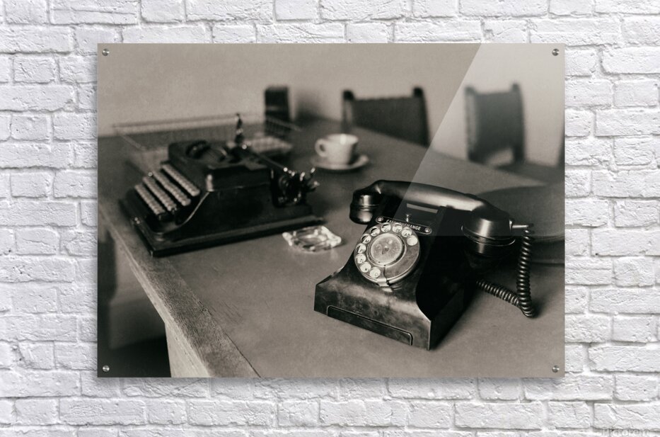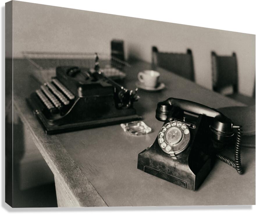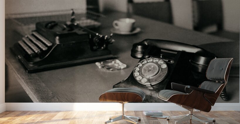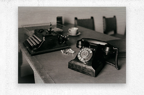 An atmospheric photograph of a vintage WWII war room desk where a well-used telephone sits in the foreground with an old typewriter just behind it. A glass ashtray cup and saucer and a document tray complete the scene each object a quiet reminder of the era. The composition evokes the tension and urgency of wartime decision-making offering a glimpse into a moment frozen in time. A great photograph for history enthusiasts and those drawn to the nostalgia of the 1940s. ..... Please Note: This image is intentionally presented with a grainy texture as part of its aesthetic.
