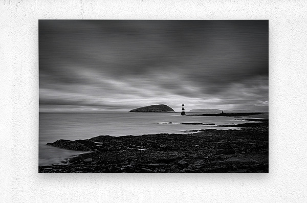 Penmon Lighthouse stands in the distance along the rugged coastline of Anglesey, North Wales. Known locally as Trwyn Du Lighthouse, it rises quietly at the edge of land and sea. A long exposure smooths the movement of water and clouds, giving the scene a calm, almost dreamlike quality. A great photograph for those drawn to remote coastlines and the quiet strength of coastal landmarks.