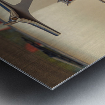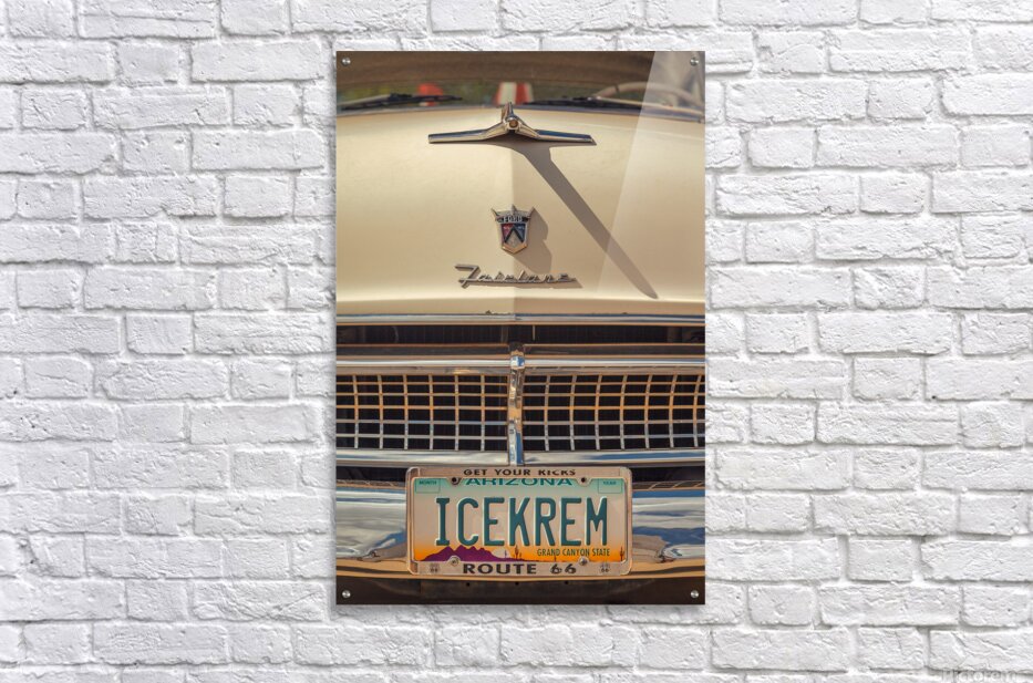 Close-up of the front of a vintage Ford Fairlane where gleaming chrome and the classic emblem take centre stage. An Arizona license plate reading ‘ICEKREM’ sits beneath with a nod to Route 66 adding to the nostalgic feel. The retro style of the image captures the spirit of mid-century Americana. A perfect photograph for lovers of classic cars and vintage roadside culture.