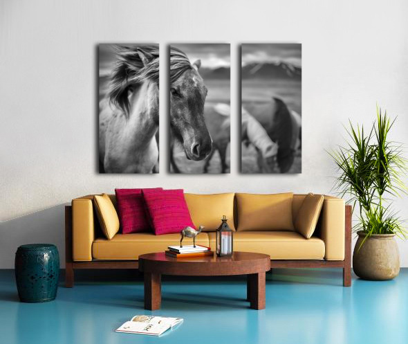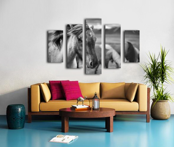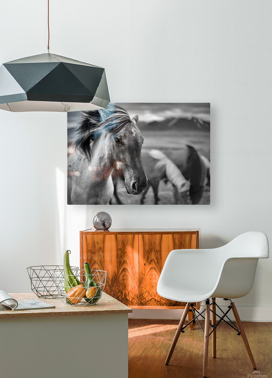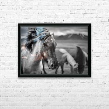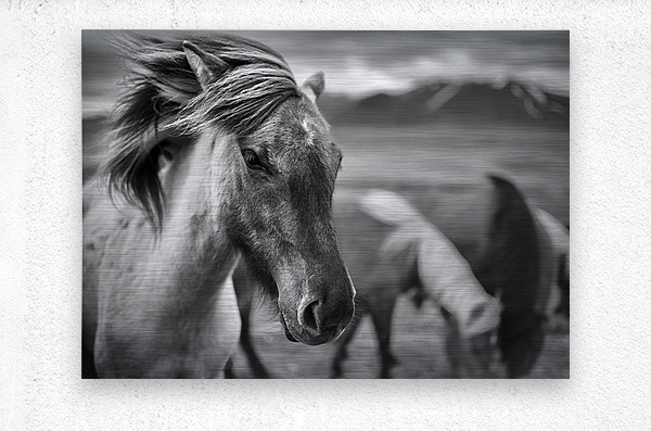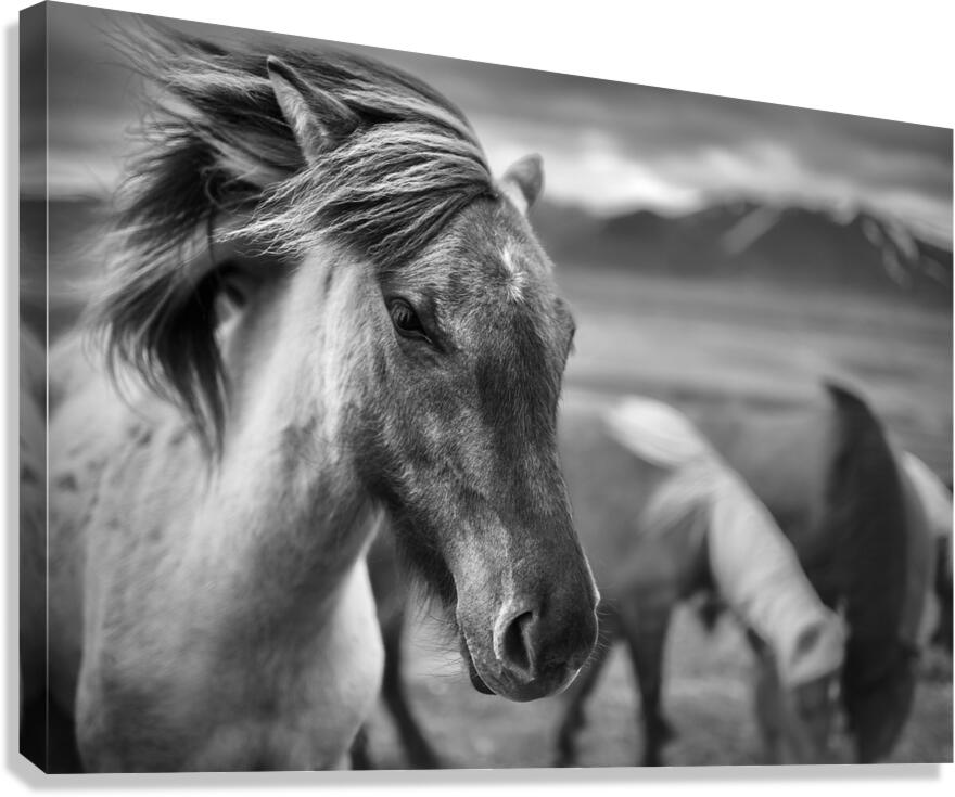 An Icelandic horse stands firm against harsh winds its mane blown by the elements. Behind it a group of horses and distant mountains fade softly into the background giving a sense of the open rugged landscape. A perfect photograph for those who appreciate the raw beauty and resilience of Iceland’s nature.