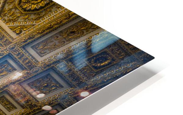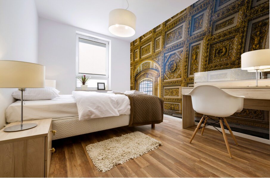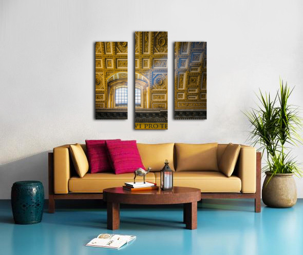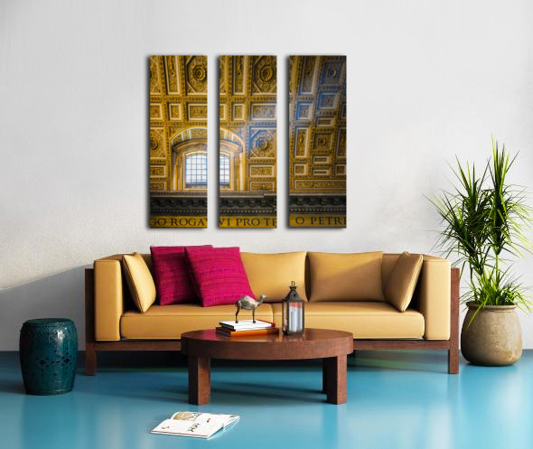 Sunlight streams through a high window set into the richly detailed gilded ceiling of St Peter’s Basilica in Vatican City Rome. The surrounding ornamentation glows with warmth drawing attention to the craftsmanship and grandeur of this sacred space. A great photograph for those who appreciate historic architecture religious heritage and the quiet drama of natural light in iconic interiors.