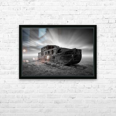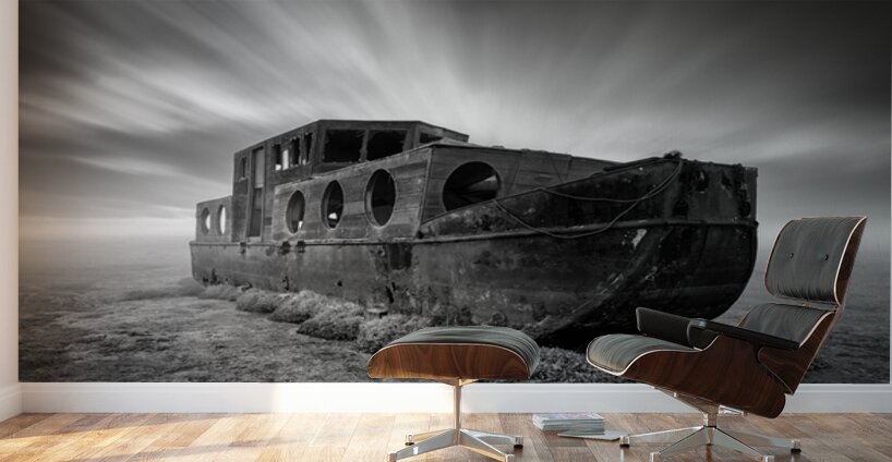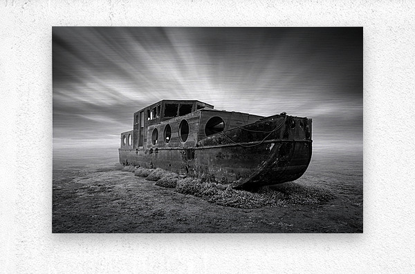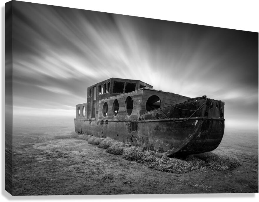 An abandoned boat lies quietly on the salt marshes at Blakeney Norfolk its worn frame surrounded by open space and silence. Above a long exposure captures streaks of cloud sweeping across the sky lending a sense of movement to the stillness below. The scene has a quiet weathered beauty—an echo of time passing. A great photograph for those who appreciate atmospheric coastal landscapes and the poetry in forgotten places.