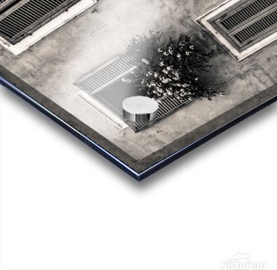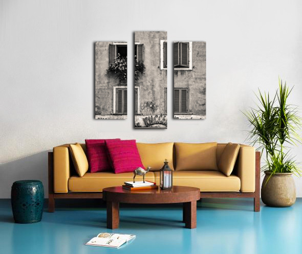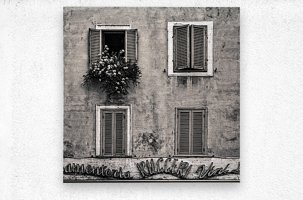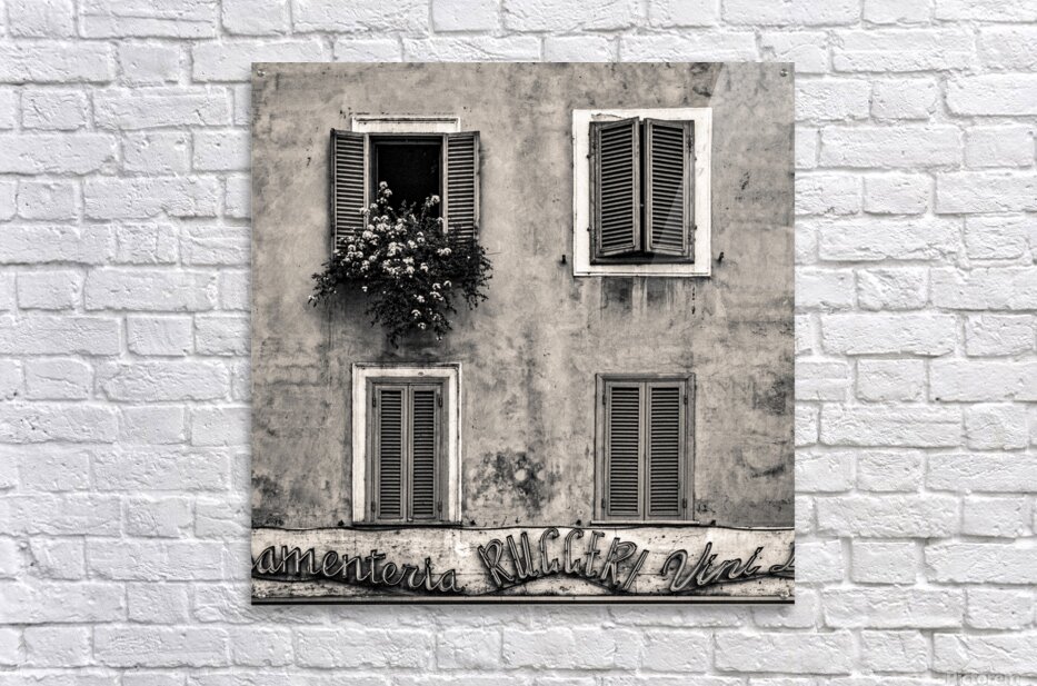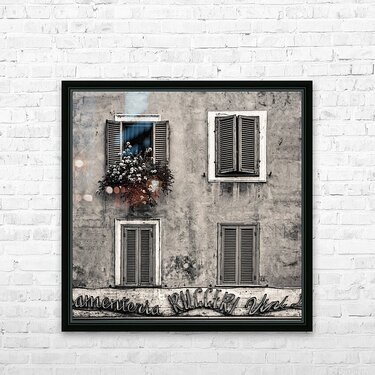Four rustic windows on a weathered Roman wall overlook a quiet Italian side street. Traditional wooden shutters frame each window their aged surfaces full of character. One shutter stands open revealing a flowering plant that spills gently outward adding a touch of life to the timeworn facade. A great photograph for those who appreciate the charm of everyday details and the textured beauty of old-world architecture. ..... Please Note: This image is intentionally presented with a grainy texture as part of its aesthetic.