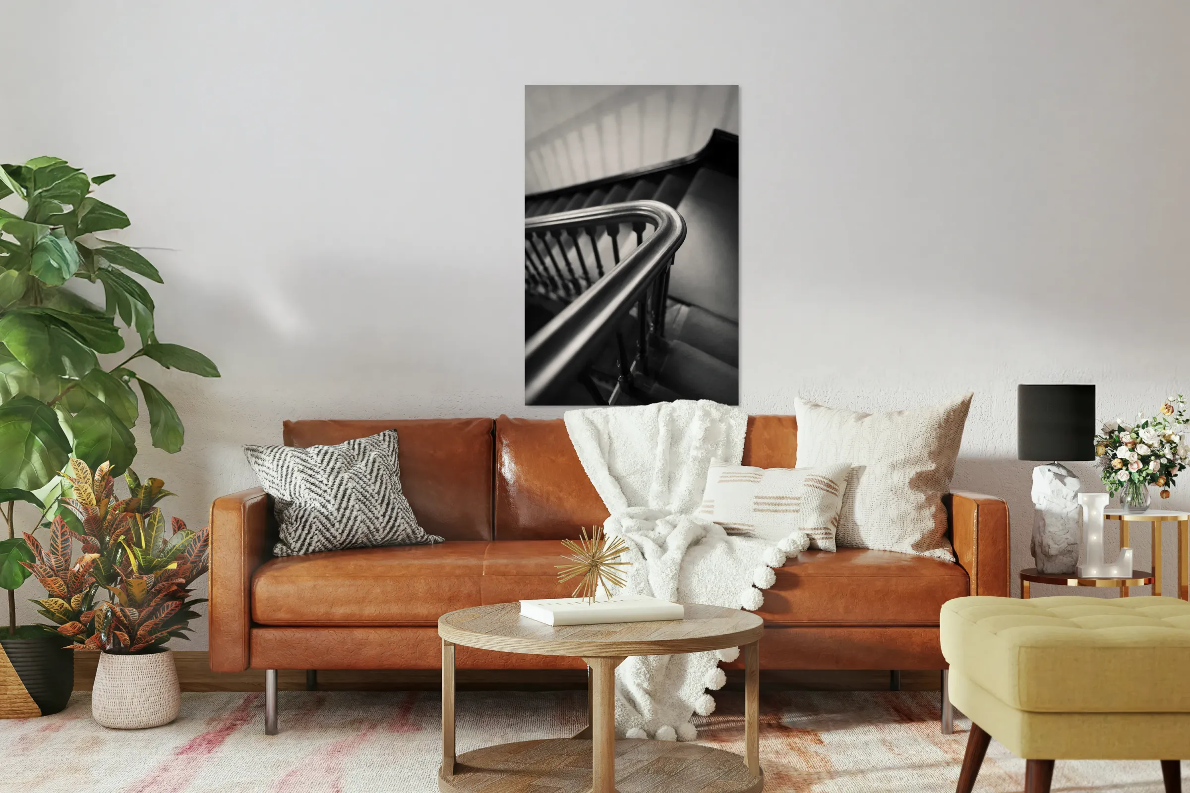 A view looking down the bannister of the staircase at Blickling House where the curve of the rail draws the eye and shadows of the balusters fall across the wall in a quiet rhythm. The scene echoes the long history of this Jacobean mansion in Norfolk once believed to be the birthplace of Anne Boleyn. A great photograph for those who appreciate historic architecture and the subtle drama of light and form. ..... Please Note: This image is intentionally presented with a grainy texture as part of its aesthetic.