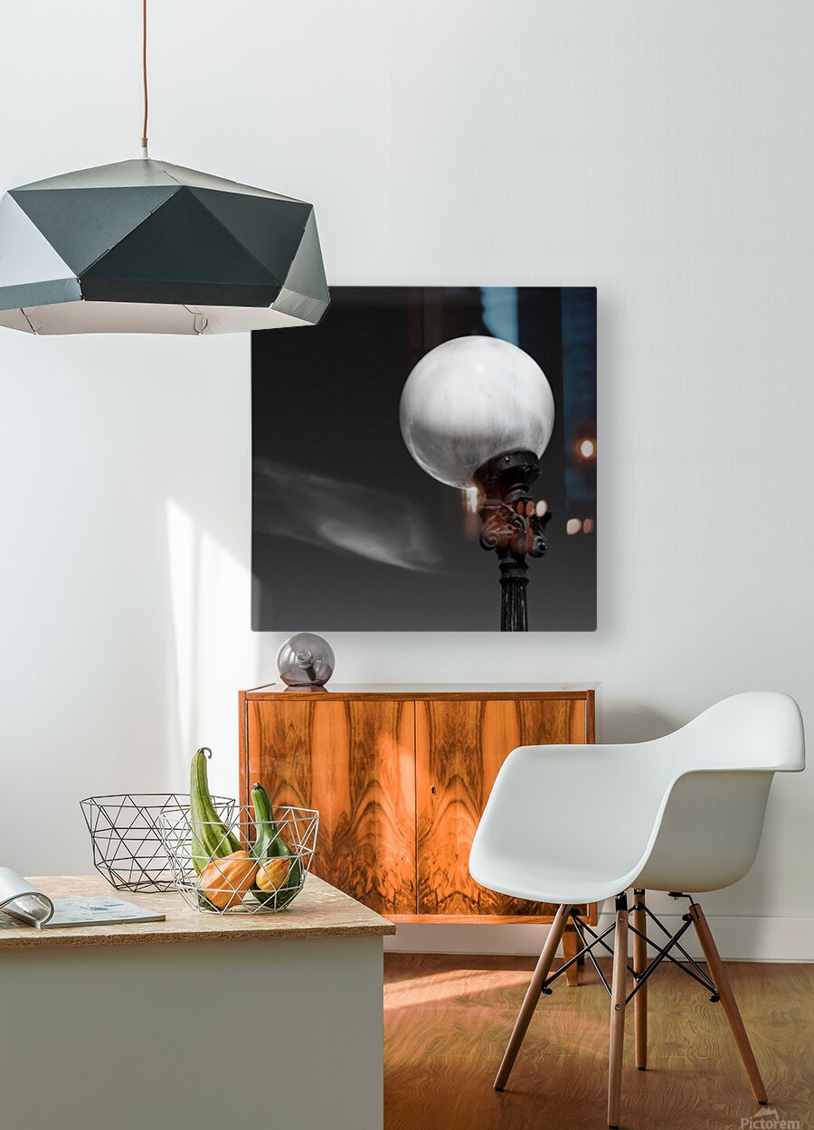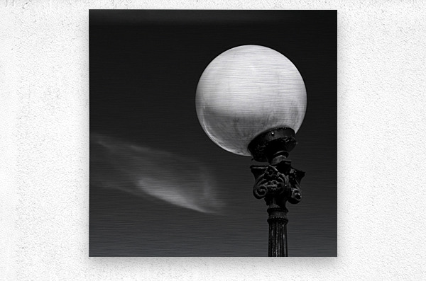 A white moon-like street lamp stands against the sky in this minimalist view from Stockholm Sweden. A single streak of cloud drifts behind it adding a...[+]