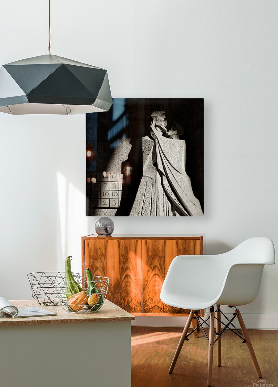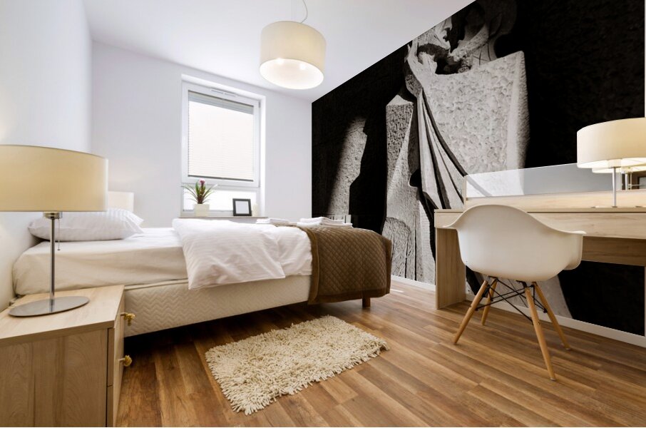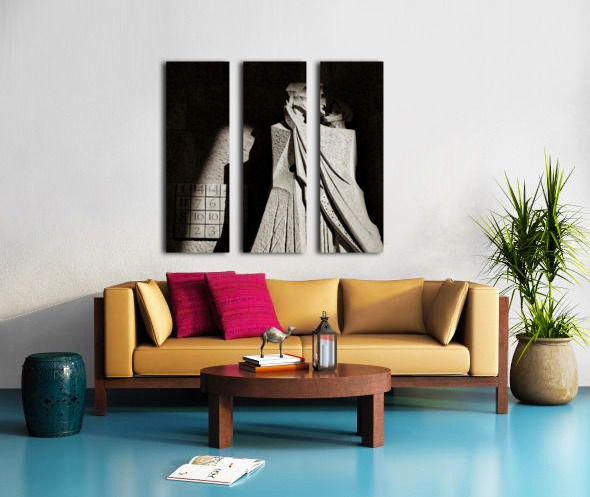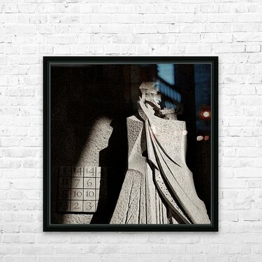 The sculpture known as The Judas Treason also referred to as The Kiss of Judas part of the Passion Facade of Barcelona’s Sagrada Família captured in early morning light. Carved by Josep Maria Subirachs its sharp angular lines are thrown into relief by the shifting light and shadow bringing out the tension and stark emotion in the scene. A great photograph for those drawn to modern religious art and the bold controversial vision that complements Gaudí’s iconic cathedral.