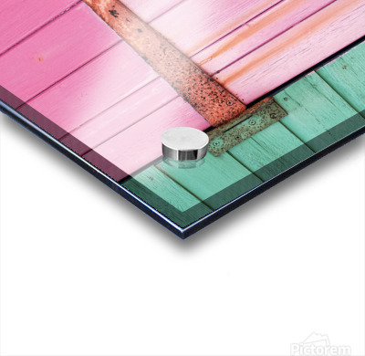 A close-up of a rusty hinge on a brightly painted beach hut in Hunstanton Norfolk. Rust streaks trail across the vivid pink door standing out against the surrounding green woodwork. A great photograph for those who appreciate bold colour contrasts and the detail found in everyday seaside scenes.