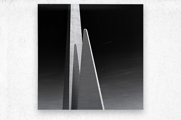 A monument at Scheveningen Netherlands captured in a way that gives it the appearance of a futuristic spaceport. Its bold angular form stands stark against a dark sky while a distant plane trails away into the atmosphere adding to the illusion of departure. The composition plays with scale and perspective blurring the line between reality and science fiction. A great photograph for those drawn to surreal urban scenes and architectural forms that spark the imagination.