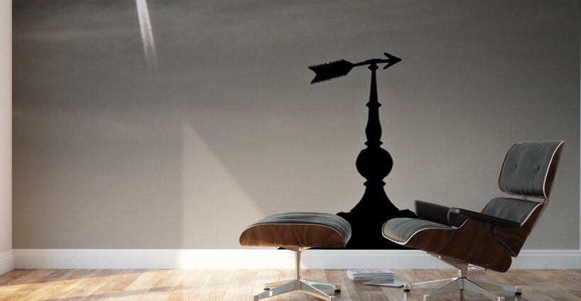 A plane passes high above the silhouette of a weather vane arrow in Burnham Overy Staithe leaving a crisp vapour trail across the clear evening sky. The contrast between the still outline of the building and the movement above creates a quiet thoughtful moment. A great photograph for those drawn to simple well-balanced scenes with a sense of space and calm.