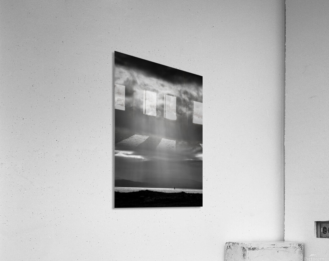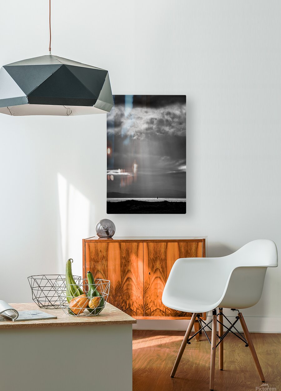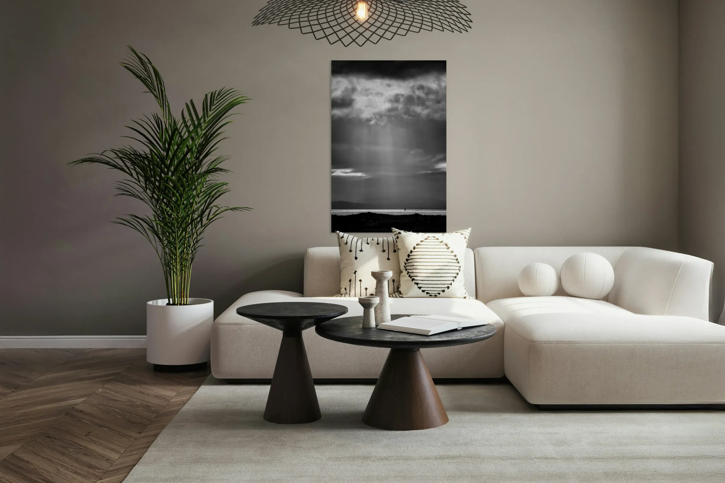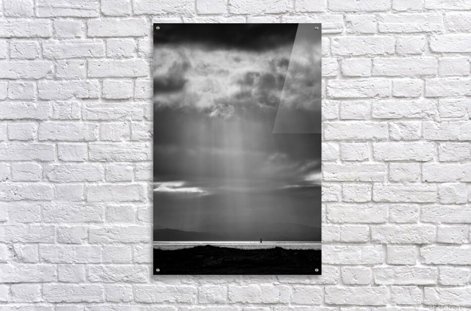 A minimalist scene on the Isle of Mull where sunrays break through storm clouds to touch the sea’s surface casting a glow across the water. The contrast between the dark clouds and light creates a quiet powerful mood that speaks to nature’s shifting moods. A great photograph for those drawn to the subtle drama of coastal Scotland.