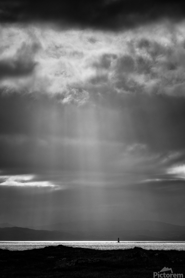 A minimalist scene on the Isle of Mull where sunrays break through storm clouds to touch the sea’s surface casting a glow across the water. The cont...[+]