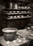 The interior of the historic Sally Lunn Bakery in Bath captured in quiet detail. A large pot of flour sits in the foreground while shelves lined with ...[+]