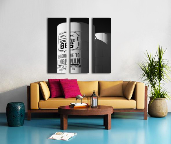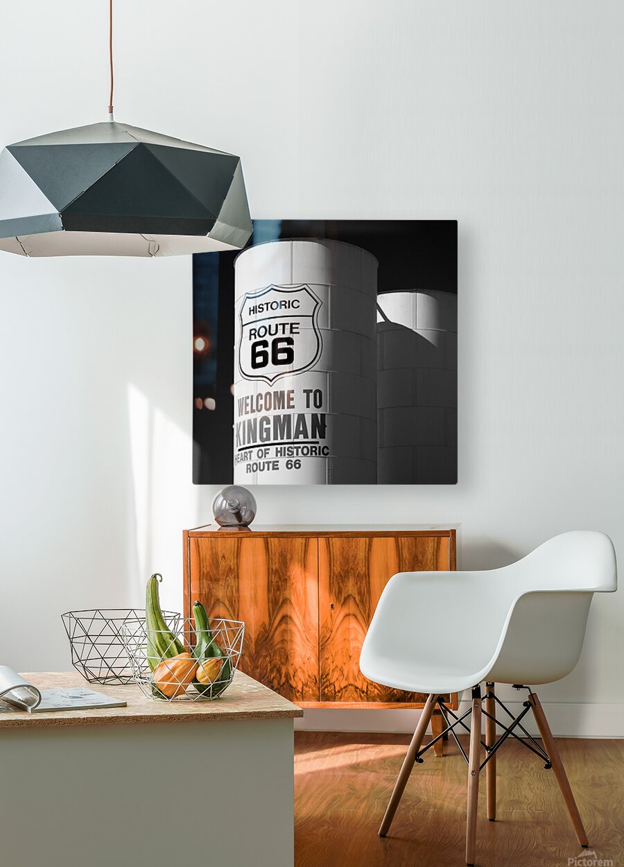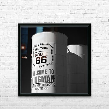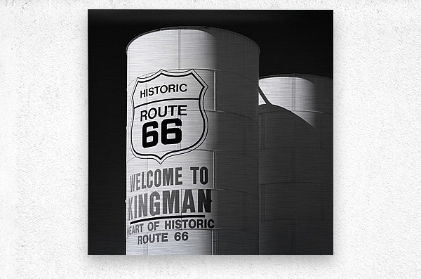 Sunlight strikes white water towers in Kingman Arizona where the words Historic Route 66 and Welcome to Kingman stand out against a deep black sky. The scene is calm yet full of character a quiet nod to the towns place along one of Americas most iconic roads. A great photograph for anyone who appreciates the atmosphere and history of classic roadside America.