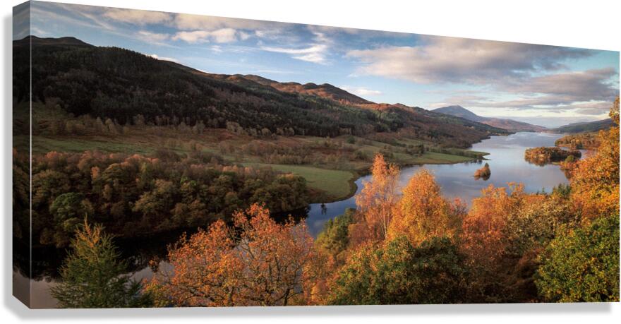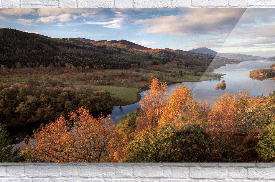 A panoramic view of autumn from Queen’s View near Pitlochry Scotland where the landscape stretches out in a rich tapestry of seasonal colour. Rolling hills and forested slopes are bathed in golden and amber tones with Loch Tummel winding through the valley below. A great photograph for anyone drawn to Scotland’s natural beauty and the quiet splendour of autumn. ..... Please note: This image has a slightly grainy texture because it was photographed on analog film.